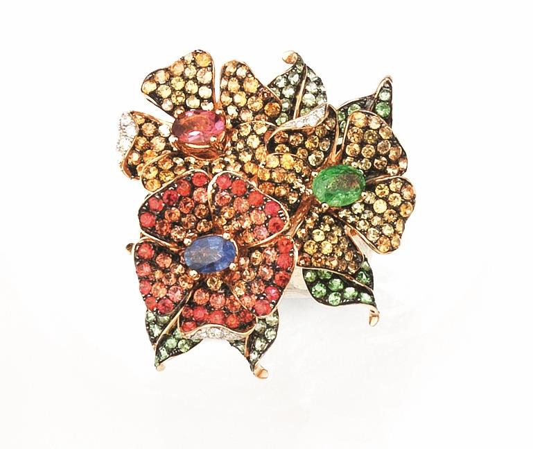 disegnato come tre corolle centrate da uno zaffiro blu, un granato verde e una tormalina rosa, petali in zaffiri gialli e arancioni e granati verdi, gambo cesellato, punzone 750, 17 g