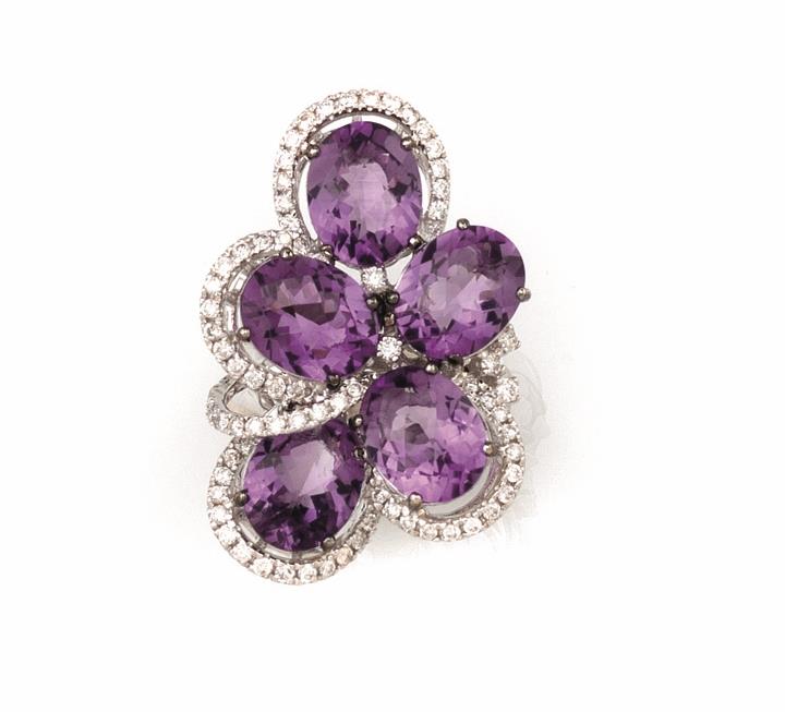 disegnato come una corolla con petali in ametiste ovali sfaccettate entro cornici in brillanti, punzone 750, 12 g