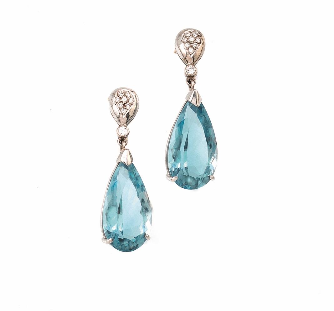 ciascuno realizzato da un motivo a goccia in oro bianco con brillanti a cui è sospesa una goccia in topazio azzurro, punzoni Torrini e 750, 15 g