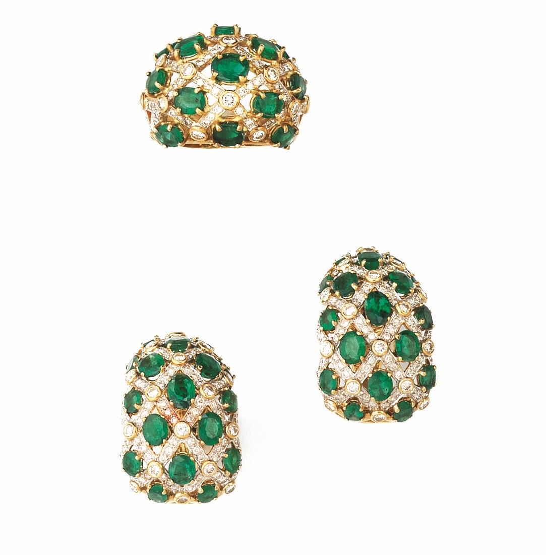 ciascun orecchino realizzato a semiovale bombato con montatura traforata a losanghe decorata in brillanti e smeraldi, 23 g; l'anello en suite con gli orecchini, 12 g