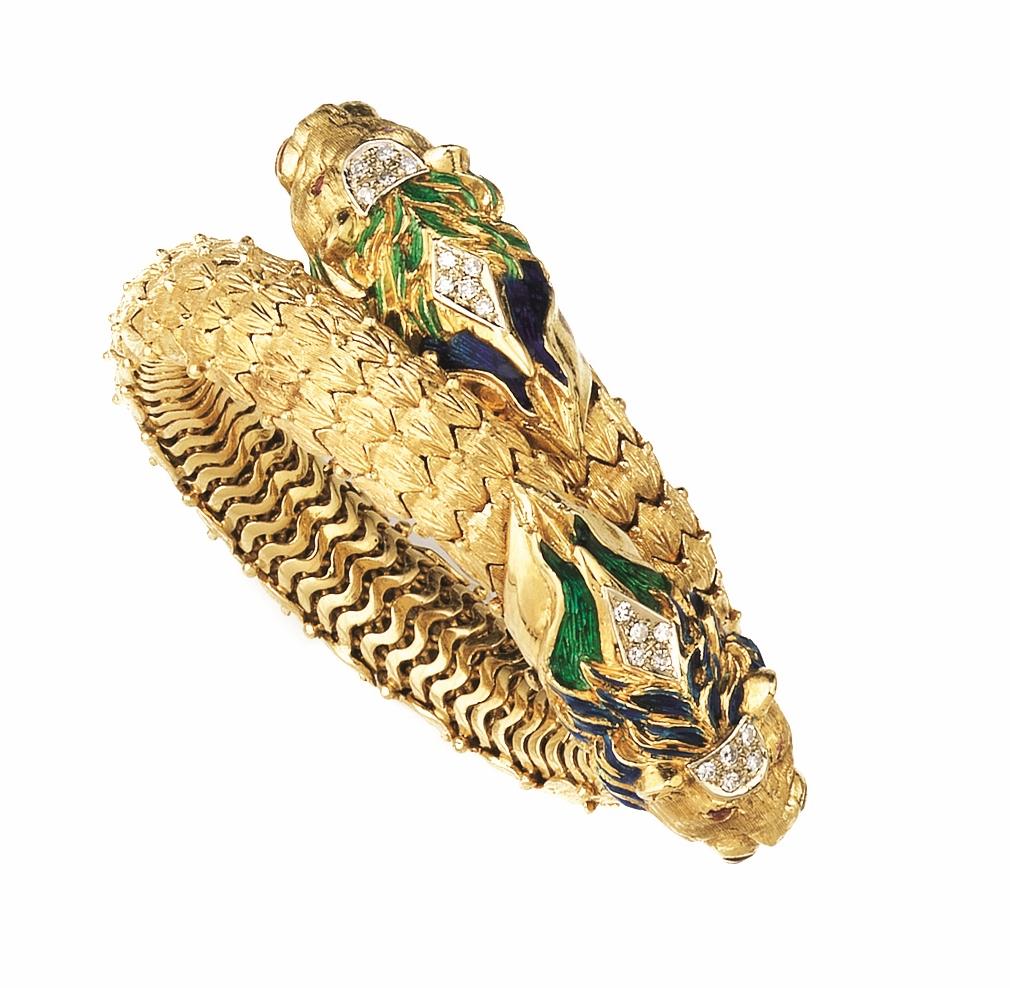 con montatura contrarie in oro cesellato a squame, finali a testa di leoni decorati in smalti policromi e brillanti, occhi in rubini, 105 g