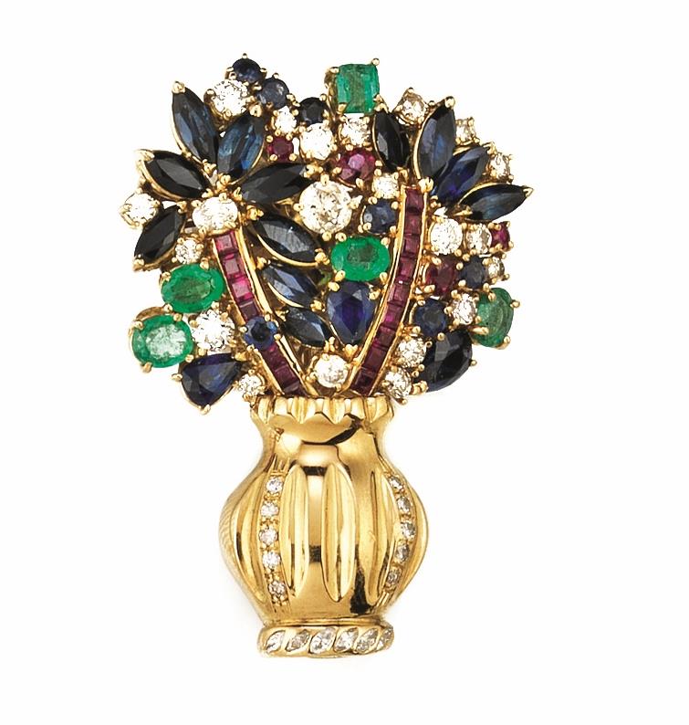 disegnata come un vaso di fiori con petali in zaffiri marquise e a goccia, smeraldi ovali e quadrati, rubini rotondi e carre e brillanti rotondi, punzone 750, 31 g