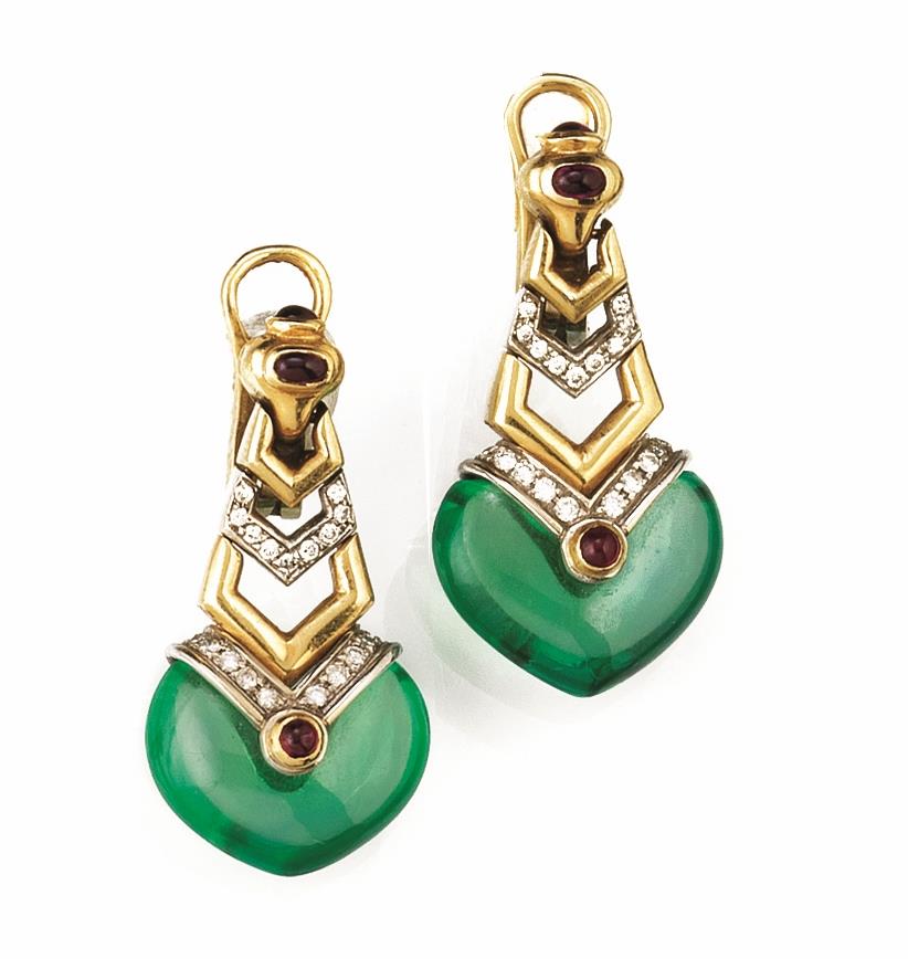 ciascuno con cuore verde pendente decorato da rubino cabochon, sospeso ad elementi geometrici traforati in oro giallo, oro bianco e brillanti, punzone 18 K, 31 g