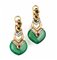 ciascuno con cuore verde pendente decorato da rubino cabochon, sospeso ad elementi geometrici traforati in oro giallo, oro bianco e brillanti, punzone 18 K, 31 g