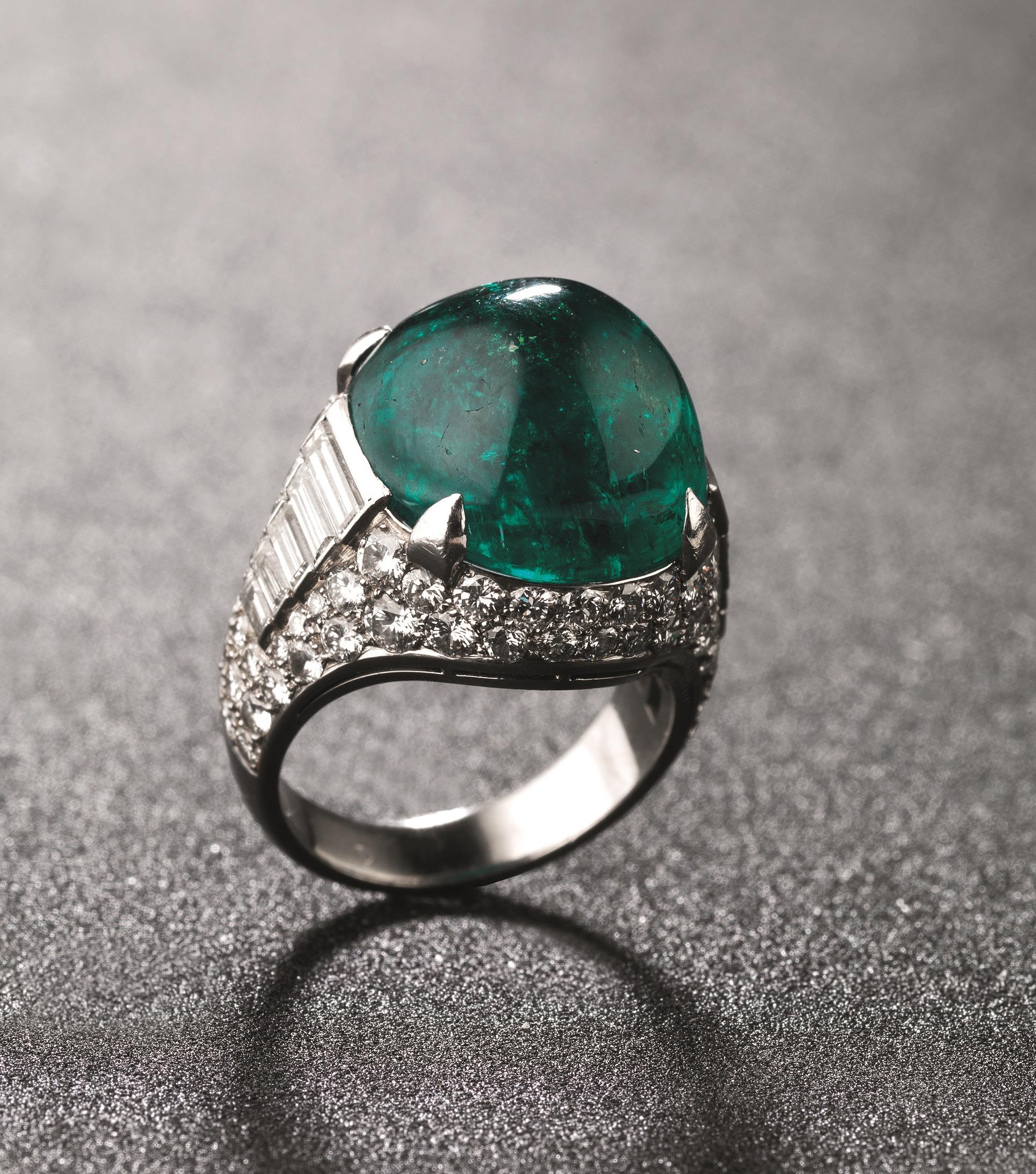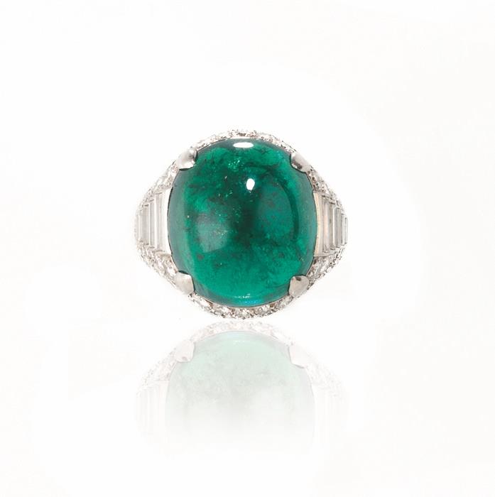 probabilmente Bulgari, con smeraldo cabochon montato a griffe, affiancato da due linee di diamanti baguette posti in gradazione entro pave di brillanti, 14 g entro astuccio Bulgari