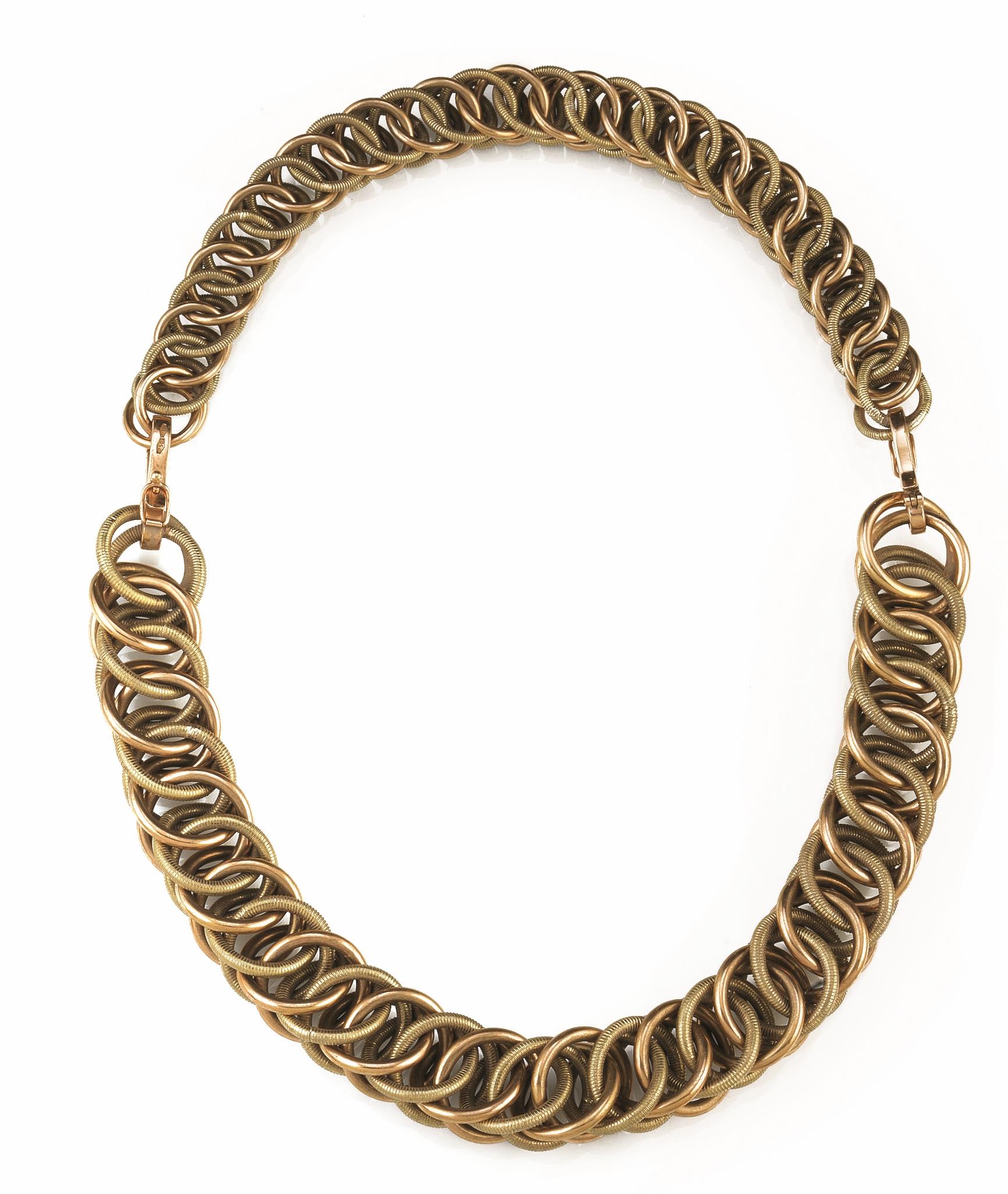 ciascuno realizzato ad una fila di maglie ad anello intrecciate in oro giallo rigato e oro rosa liscio, di due dimensioni diverse, unibili a formare una collana, punzone 750, 272 g complessivi