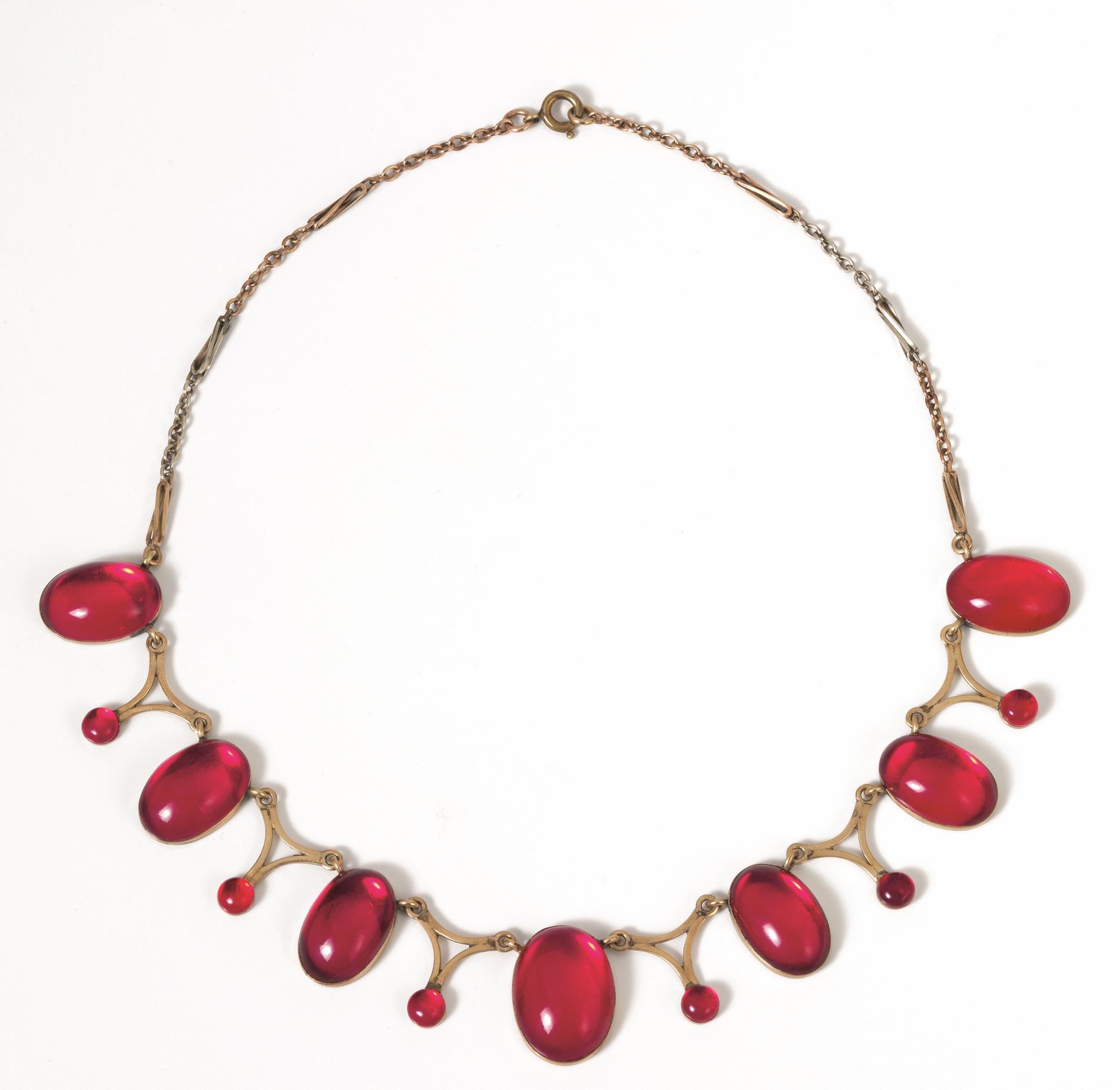 realizzata ad una fila di sette cabochon in ambra rossa intercalati a maglie in oro a basso titolo con finali in  in ambra cabochon rotonda, 25 g  entro scatola