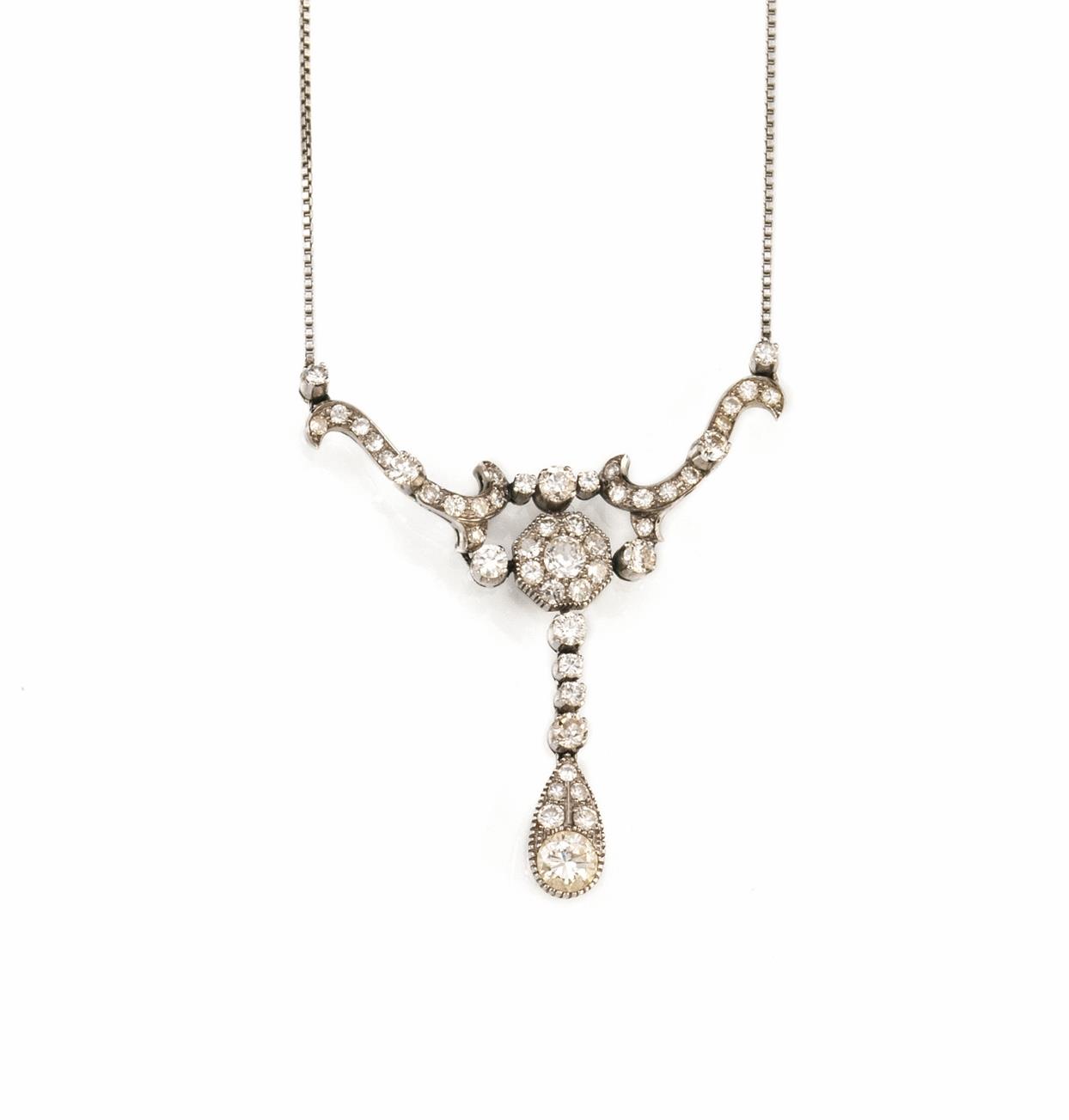 con elemento centrale a volute decorate in brillanti taglio vecchio e moderno con goccia pendente, fermatura a volute analogamente decorata, 11 g