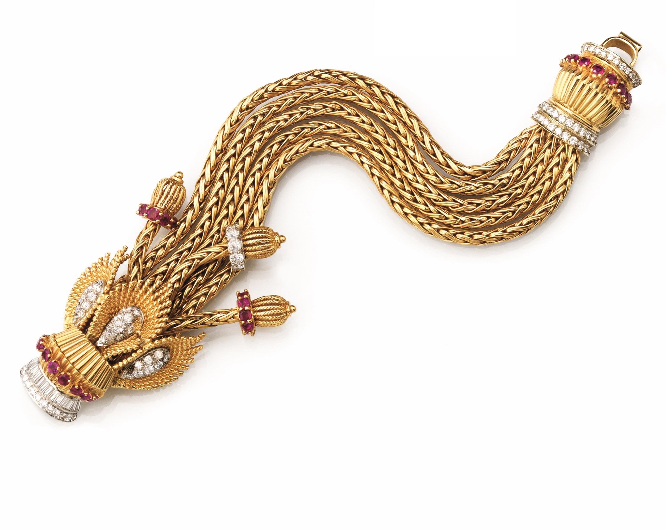 realizzato come un nastro morbido a cinque fili intrecciati, fermatura arricchita da foglie e nappe in brillanti rotondi, baguette e rubini, 149 g