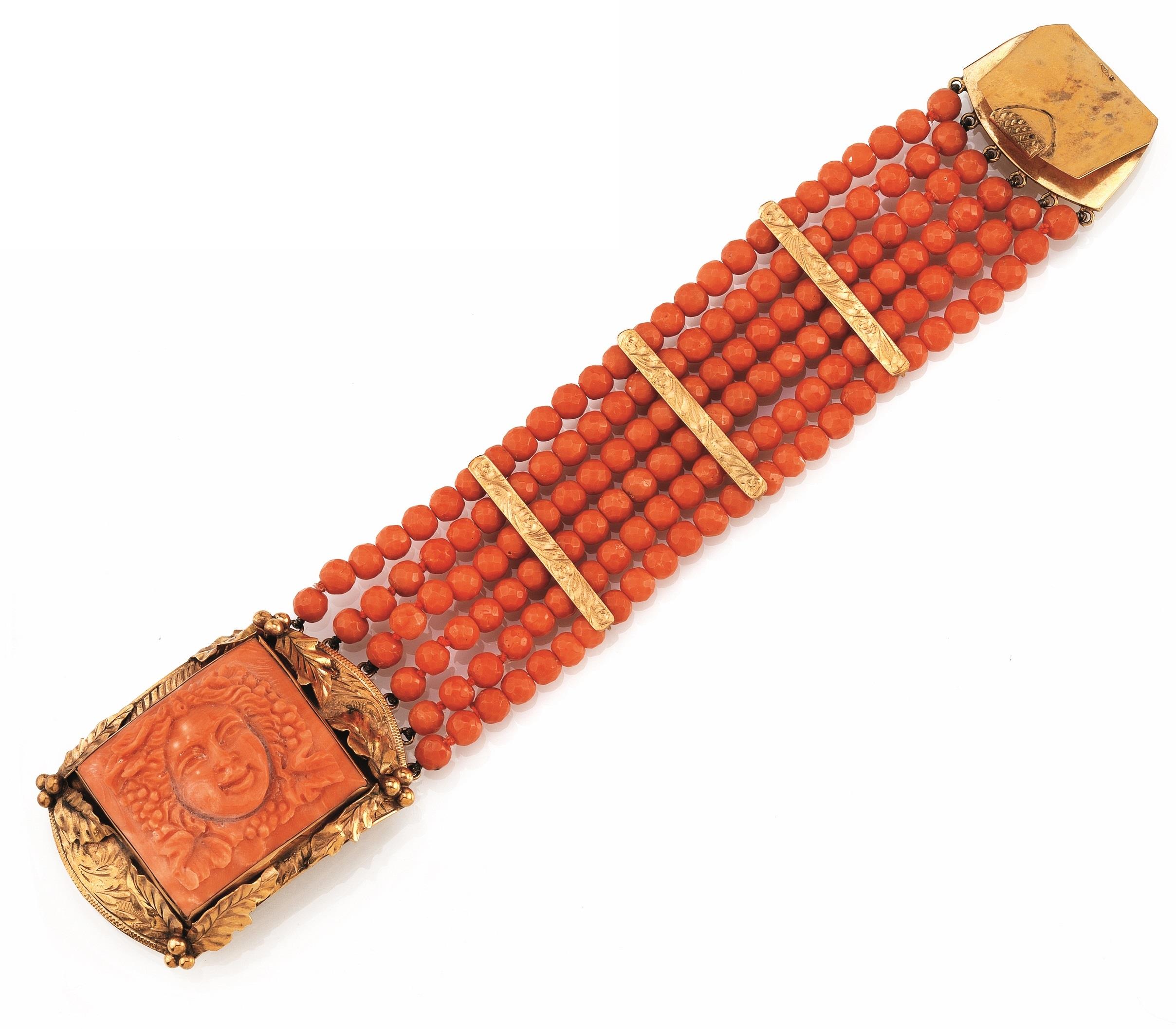realizzato a sei fili di sfere sfaccettate in corallo unite da barrette in oro cesellato, fermatura rettangolare con corallo intagliato raffigurante Bacco entro cornice fogliacea in oro, punzone 375, 109 g