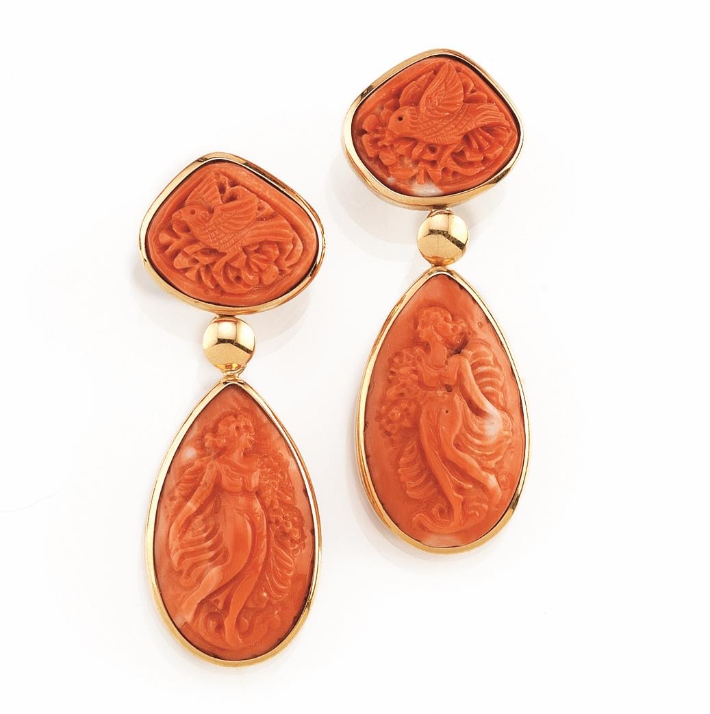 ciascuno con corallo intagliato raffigurante un uccellino, a cui è sospesa una mezza sfera in oro giallo con goccia pendente in crollao raffigurante una figura femminile, 34 g