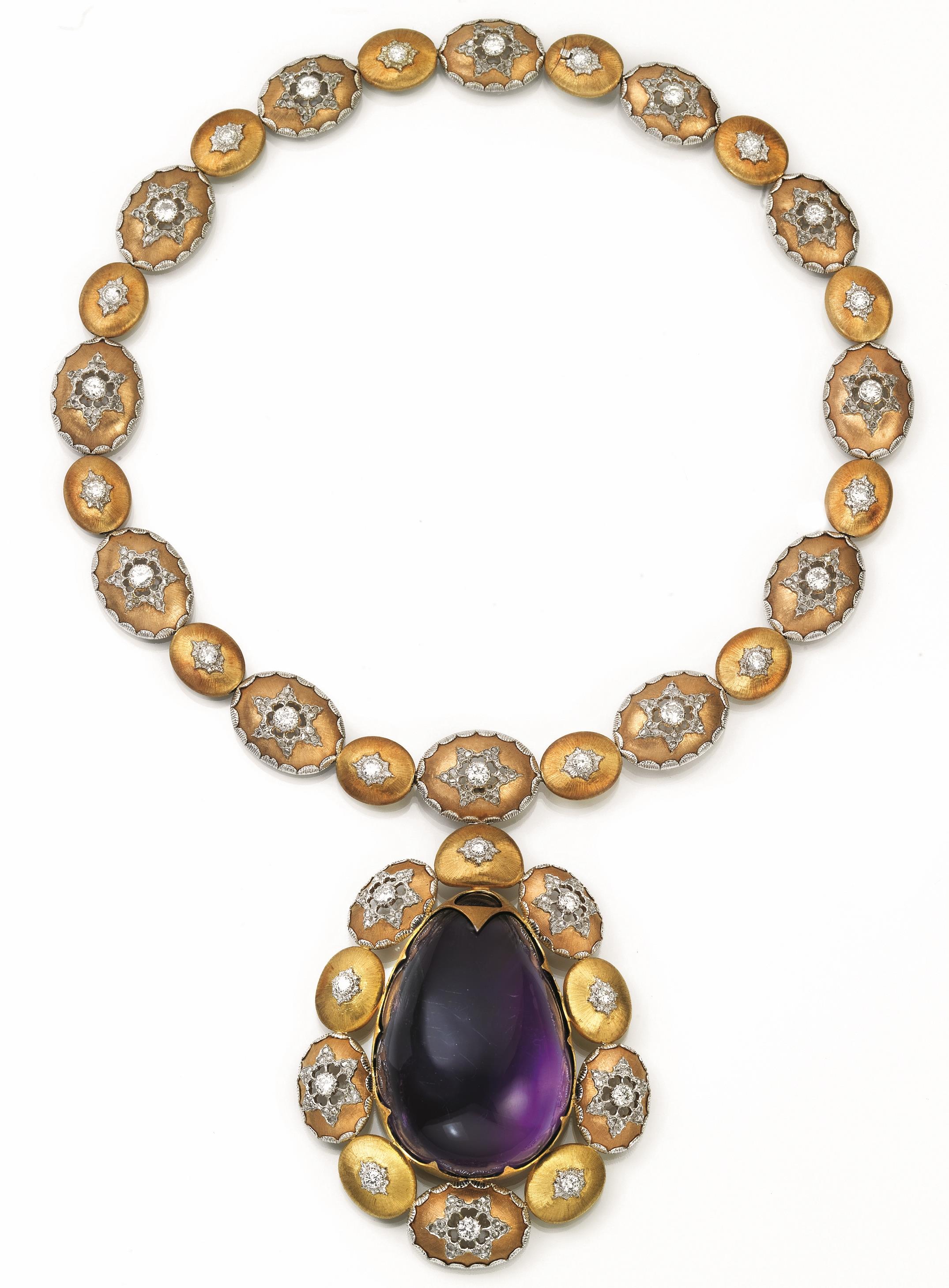 realizzata ad una fila di elementi ovali cesellati impreziositi da motivi a stella in brillanti e rose di diamante, al centro un pendente amovibile con ametista cabochon entro cornice analogamente decorata, punzoni Buccellati, Italy, 750 18 K Ar, entro astuccio Buccellati New York, 63 g una rosa mancante