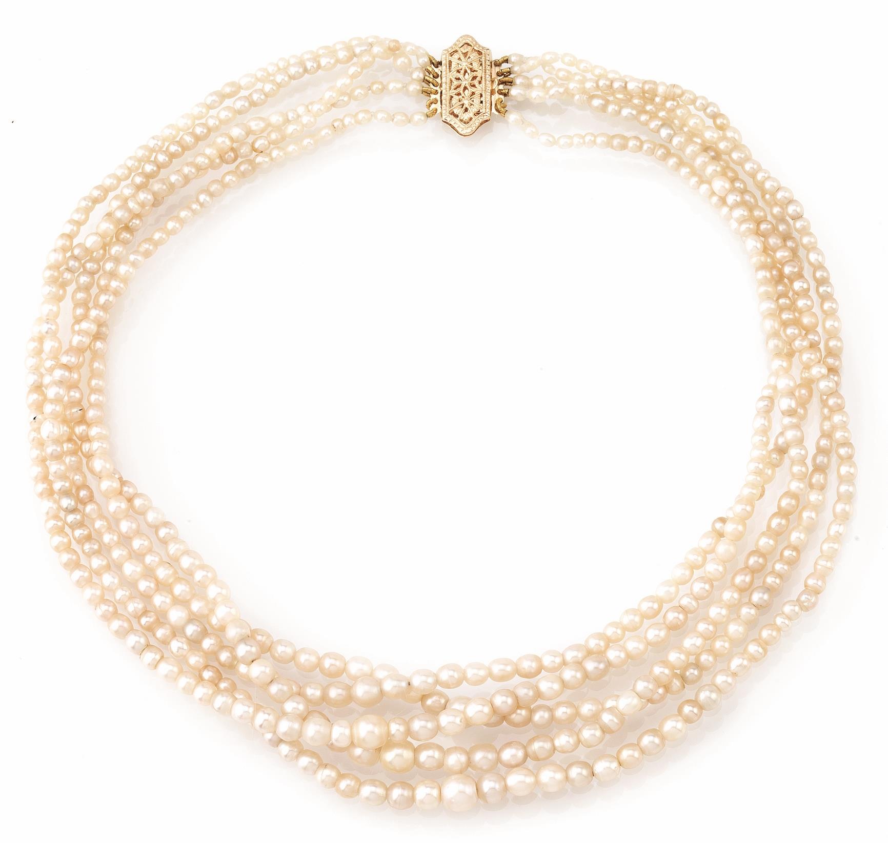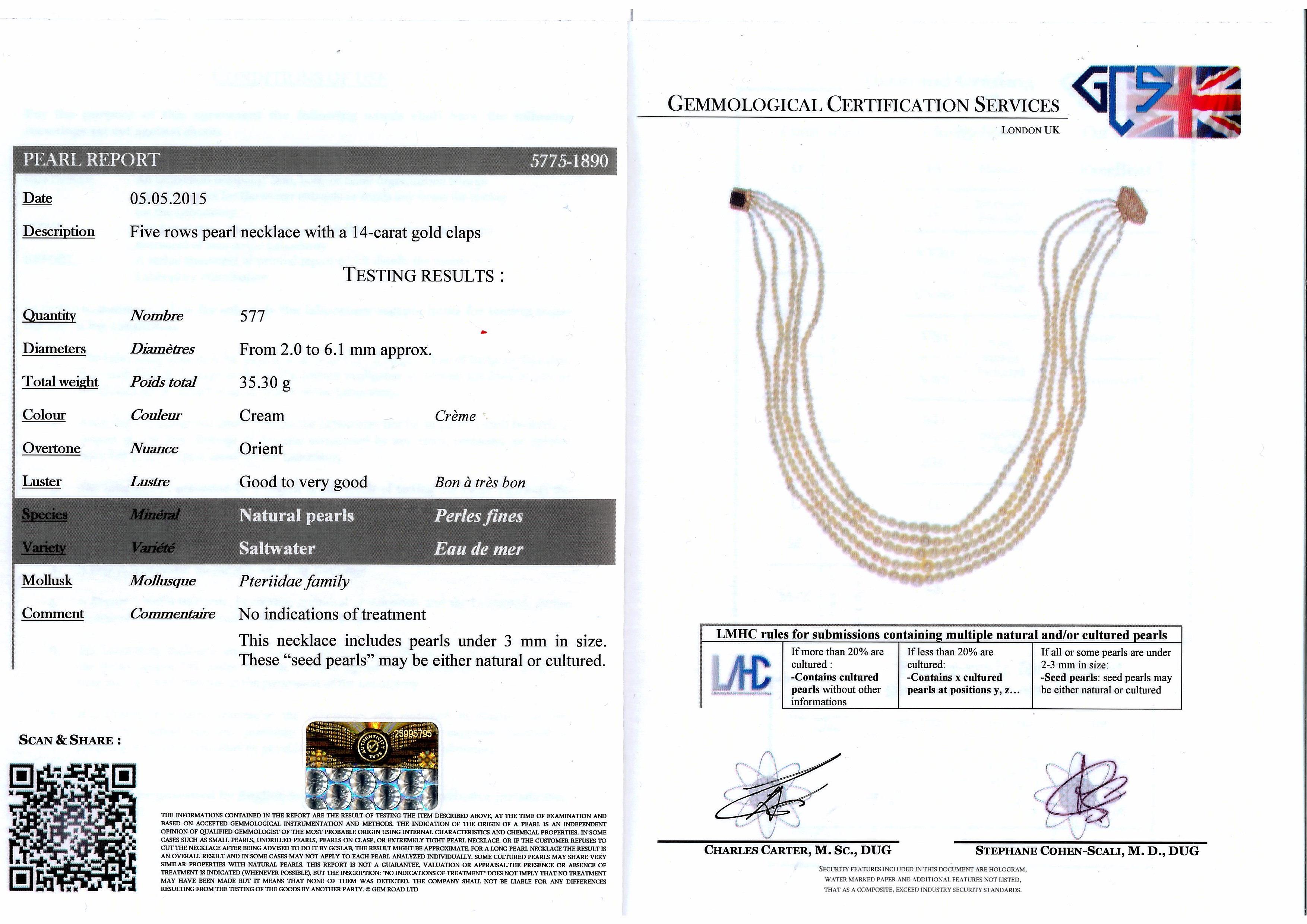 realizzata a cinque fili di perle naturali con fermatura in oro giallo traforato a motivi floreali, corredata di certificato GLS n. 5775-1890, datato 05/05/2015