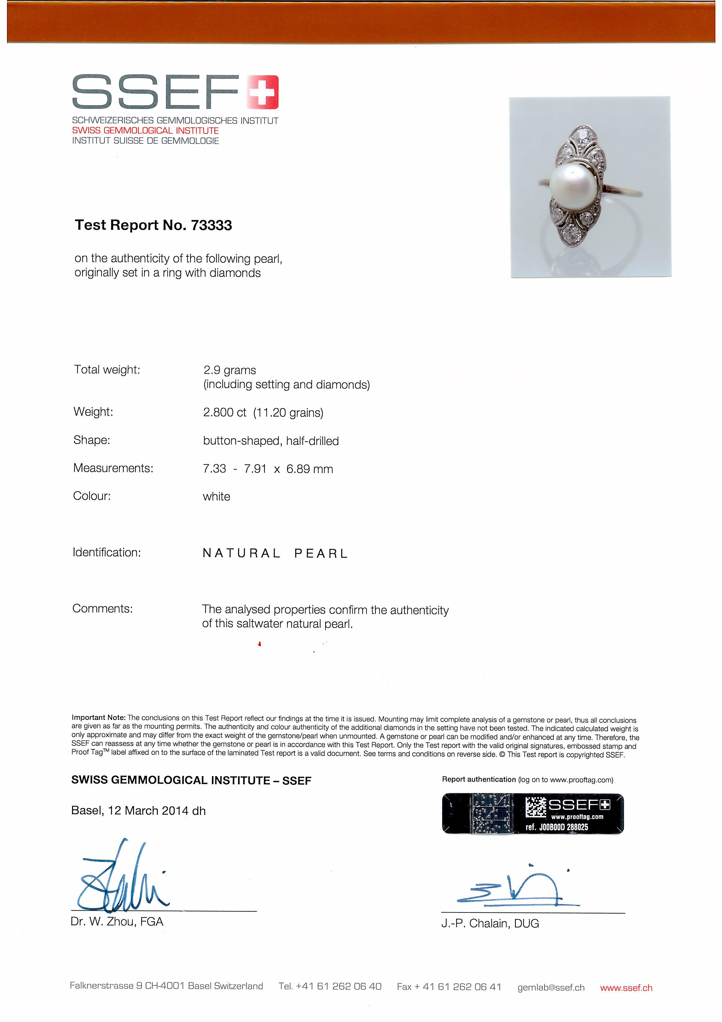 modellato come una marquise con montatura traforata decorata in brillanti, al centro una perla naturale corredata di certificato SSEF n. 73333, datato 12/03/2014