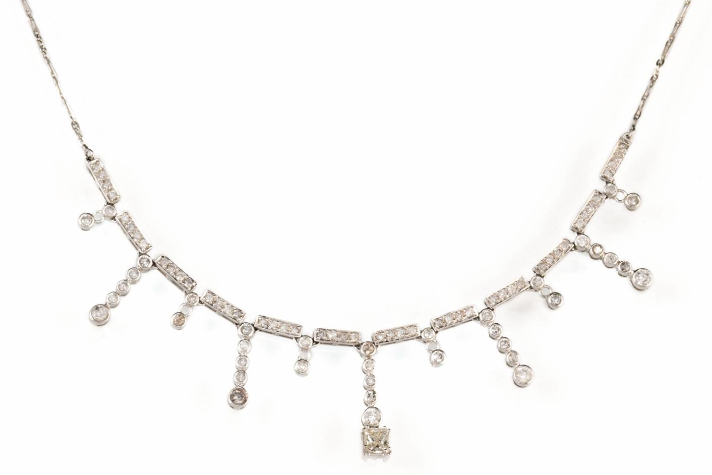 decorata al centro da barrette rettangolari in brillanti a cui è sospesa una frangia in diamanti rotondi posti in linea, al centro un brillante con profilo quadrato, punzone 750, 9 g