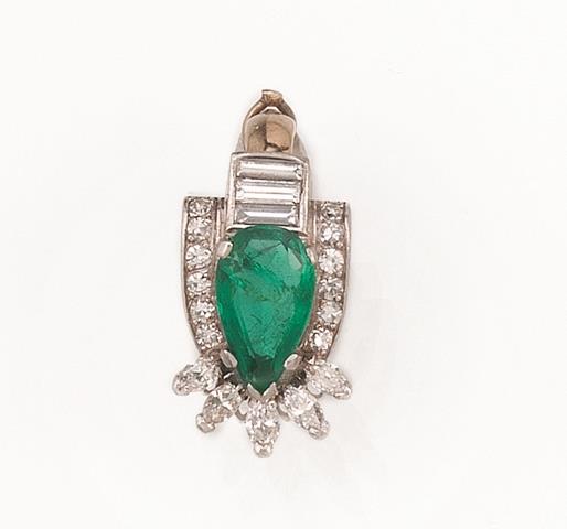 di forma sagomata con smeraldo a goccia entro cornice in brillanti taglio huit huit, baguette e marquise, 7 g
