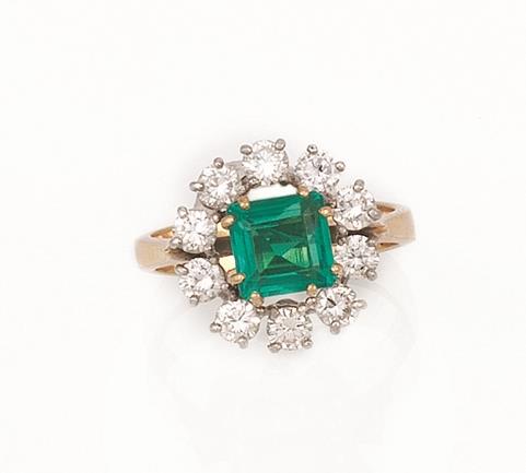 realizzato a margherita con smeraldo quadrato entro cornice ondulata di brillanti, punzone 750, 7 g
