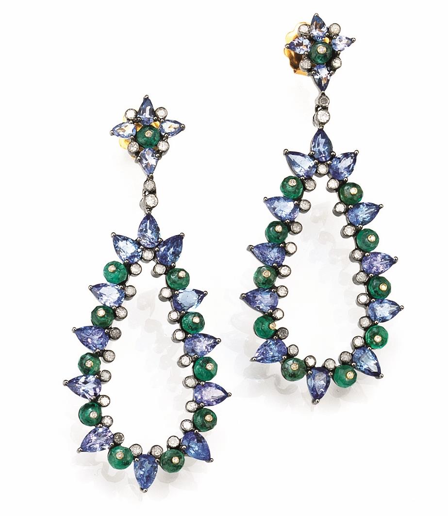 ciascuno modellato a goccia con smeraldi a ribes, tanzaniti e brillanti, punzone 18 K, 14 g