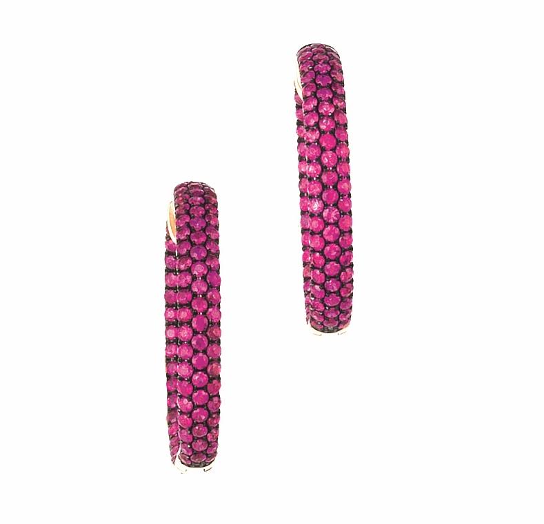 ciascuno modlelato come un anello ovale bombato, decorato nella parte anteriore e interna da rubini montati in oro brunito, punzone 750, 11 g