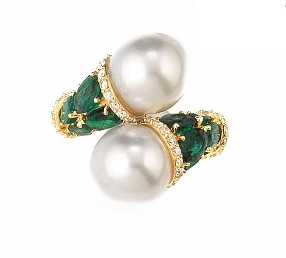 ANELLO IN ORO GIALLO, PERLE, SMERALDI E DIAMANTI