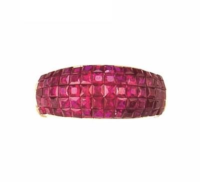 realizzato a fascia bombata decorata con rubini carré affiancati da linee di baguette, punzone 750, 5 g