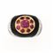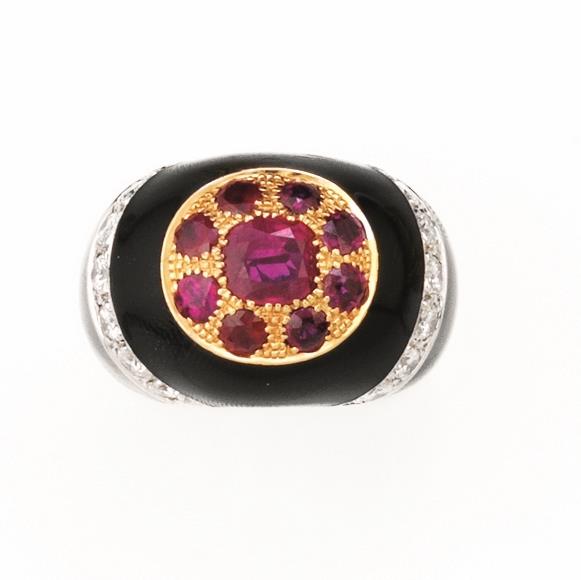 a fascia bombata decorata da smalto nero impreziosito da due inserti in oro bianco e brillanti, al centro un motivo circolare in oro giallo e rubini, 25 g