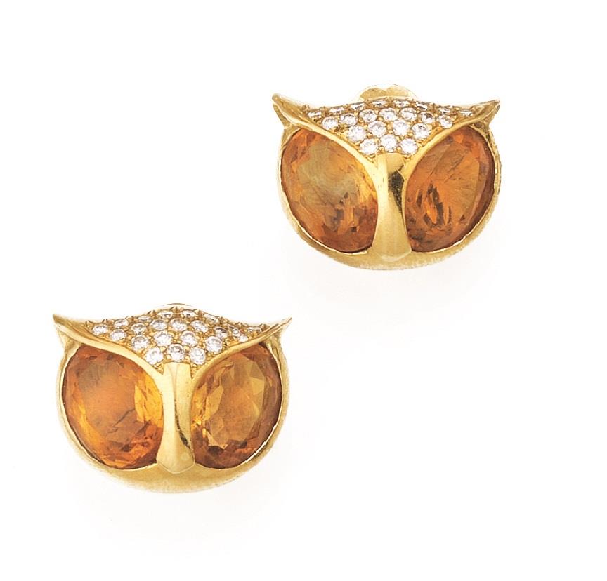 ciascuno realizzato a testa di gufo decorata in brillanti con occhi in citrini, en suite con le clips, punzone 750, 23 g