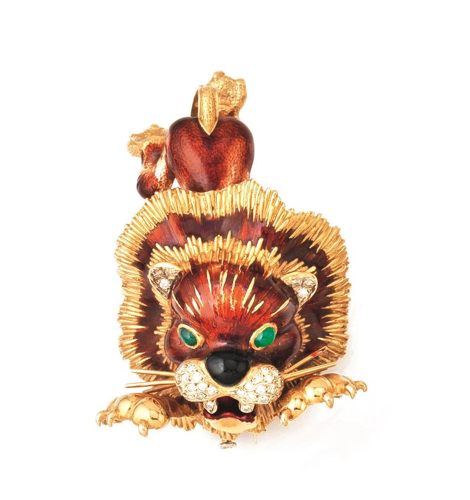modellata a leone, corpo decorato da smalto rosso, particolari in brillanti e occhi in calcedoni verdi, punzoni Modele Depose FC, 750, Made In Italy, 65 g