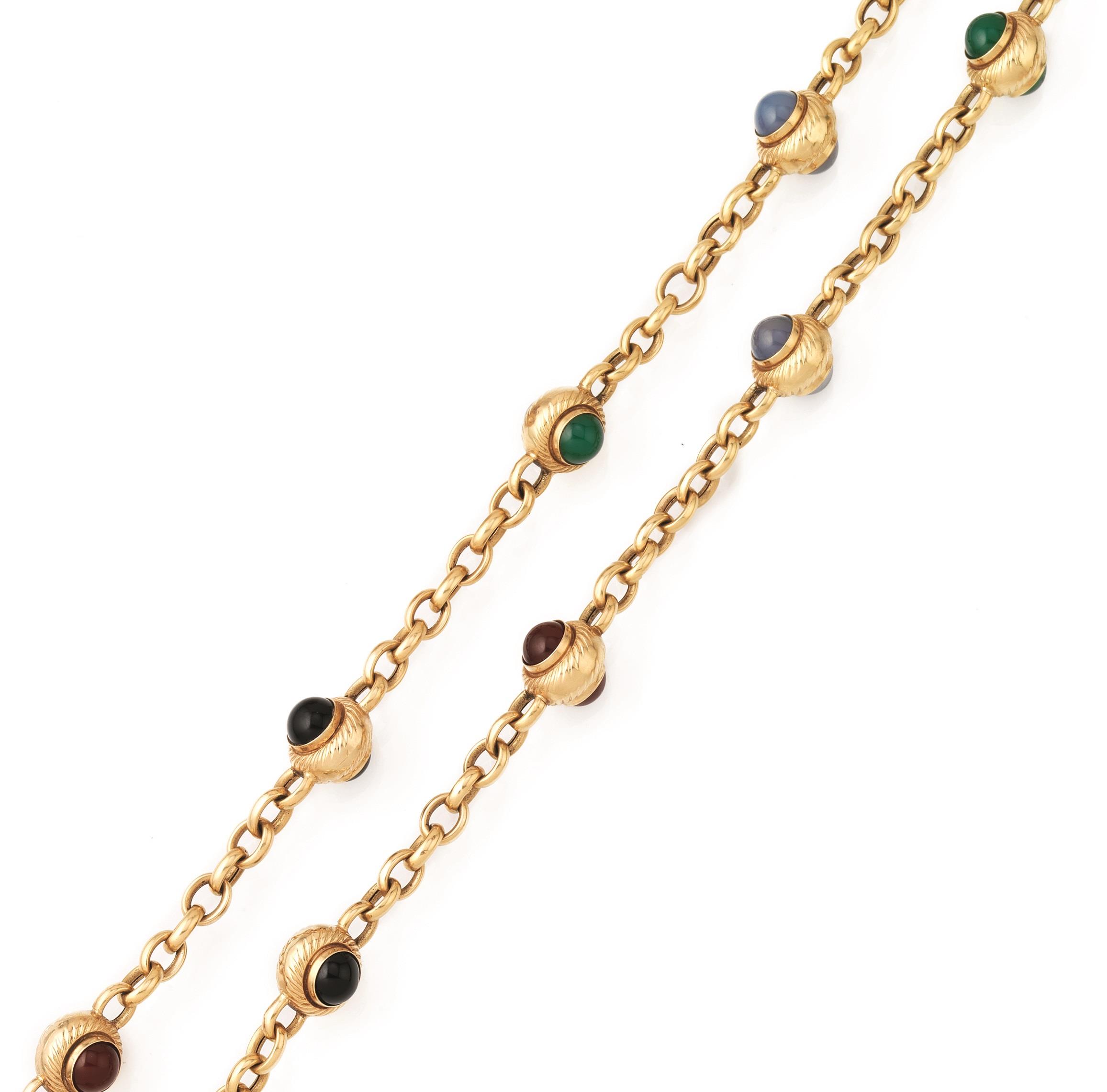 realizzata a maglie ad anelli ovali intercalate da coppie di calcedoni cabochon montate entro castoni ad anello bombato e cesellato, punzone 750, 109 g