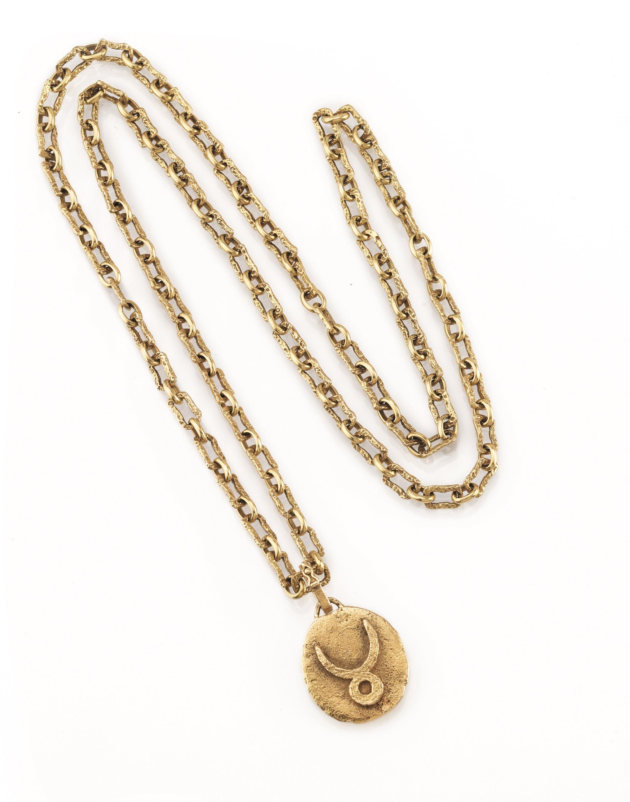 a maglie ovali in oro liscio e rettangolari sagomate in oro martellato con pendente circolare raffigurante il segno zodiacale del toro, punzoni Masenza e 750, 114 g
