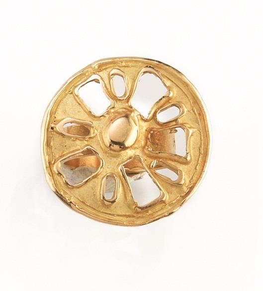 realizzato come un disco traforato in oro giallo satinato con elementi astratti, punzoni Mastroianni e 750, 13 g