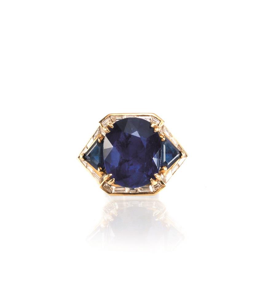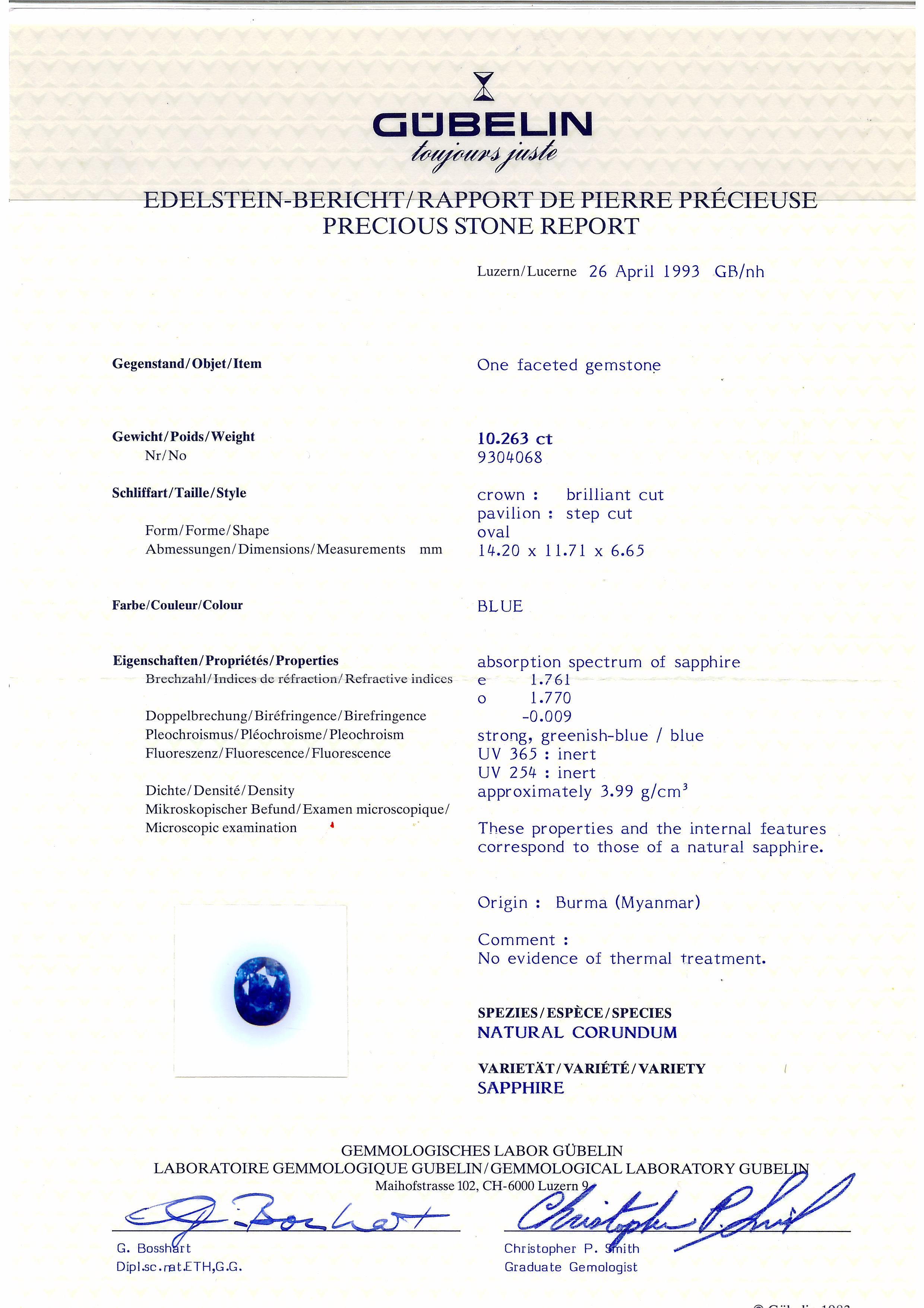 al centro uno zaffiro ovale di 10.26 ct affiancato da due zaffiri triangolari per complessivi 1.80 ct, il tutto entro cornice di diamanti baguette per1.22 ct, corredato di certificato GUBELIN n. 9304068, datato  26/04/93 che indica origine birmana e assenza di trattamento termico
