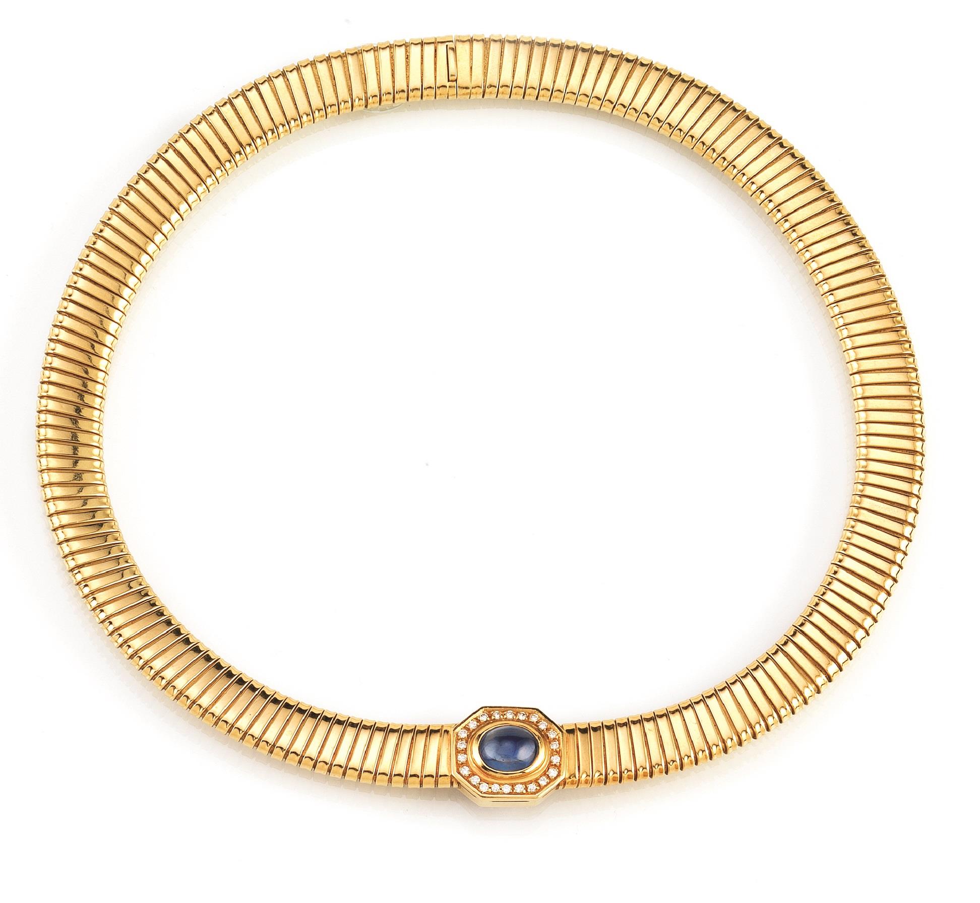 a maglia tubogas schiacciata, al centro uno zaffiro cabochon entro cornice ottagonale in oro giallo e brillanti, punzoni 15 VR e 750, 68 g