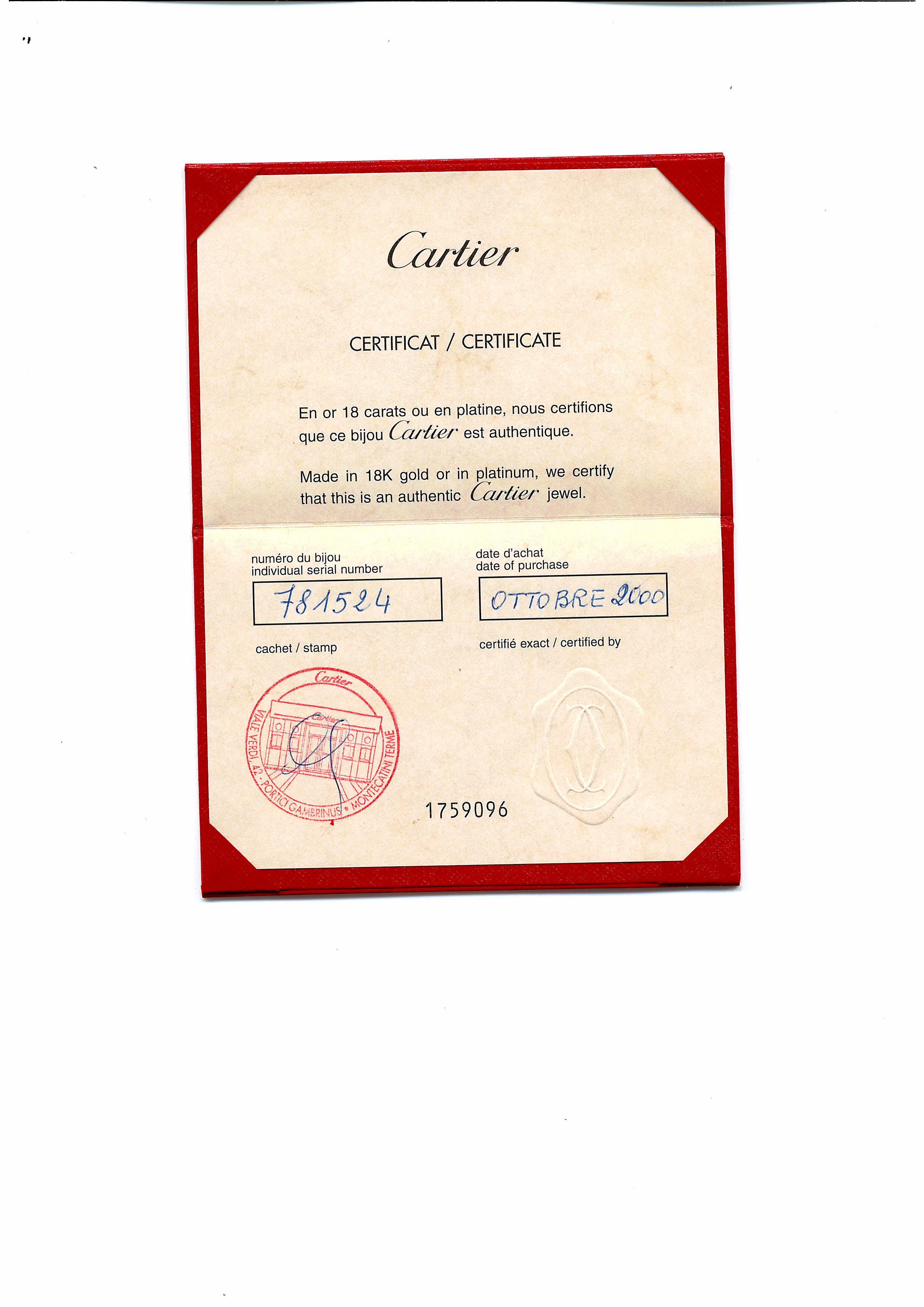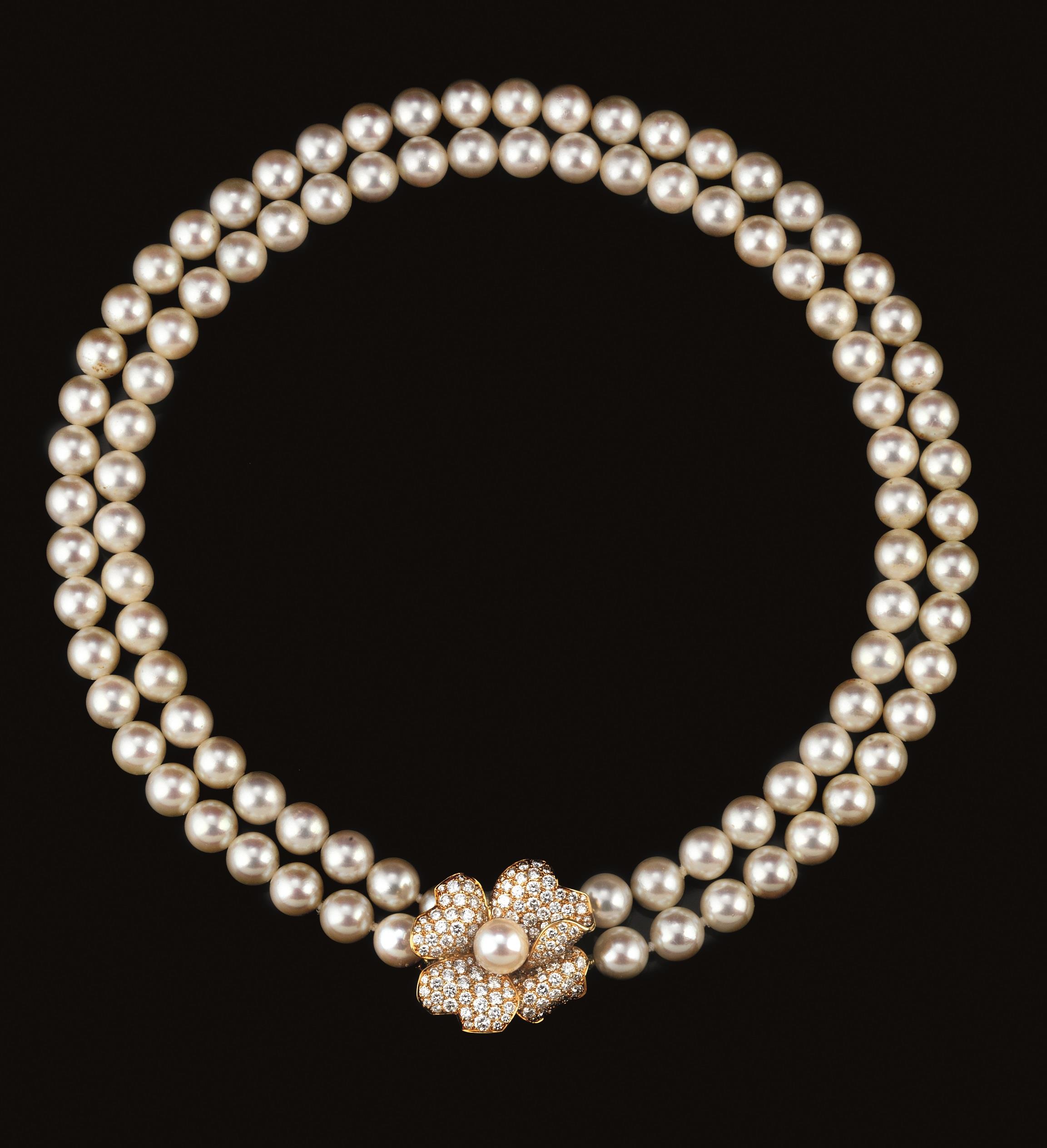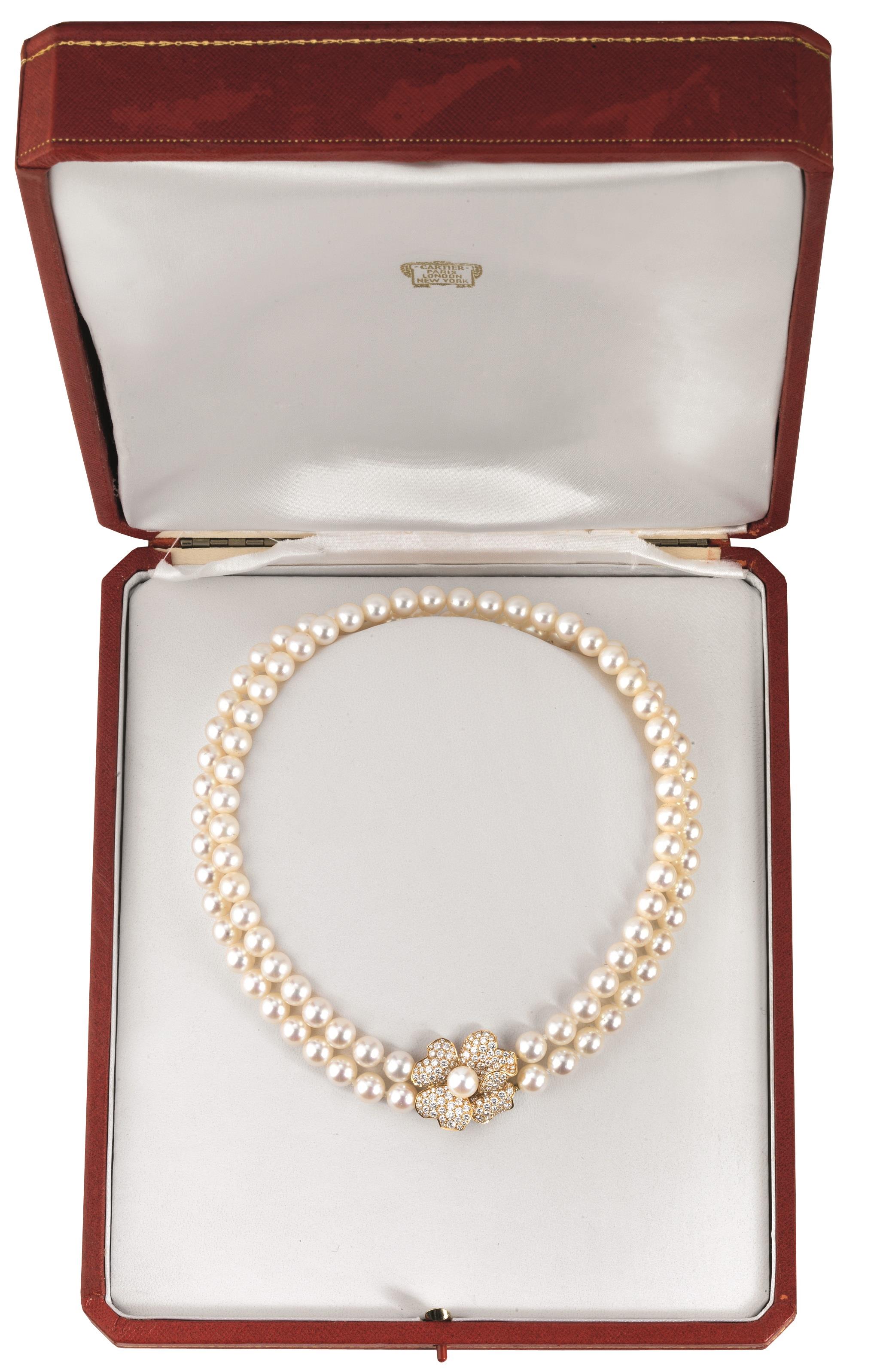 a due fili di perle coltivate di diam. 8-8.5 mm con fermatura a corolla con pavé di brillanti e perla centrale, punzoni Cartier, 781524 e 750, con scatola e garanzia