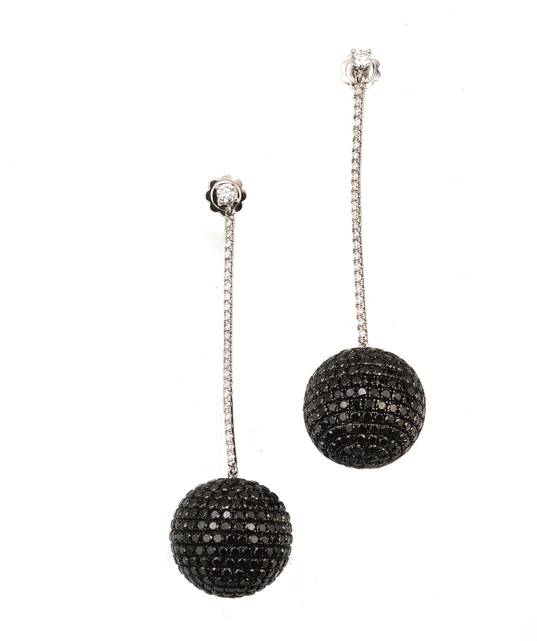 ciascuno realizzato con un diamante incolore a cui è sospesa una barretta in oro bianco e brillanti con finale una sfera in oro brunito e diamanti neri, punzone 750, 16 g