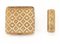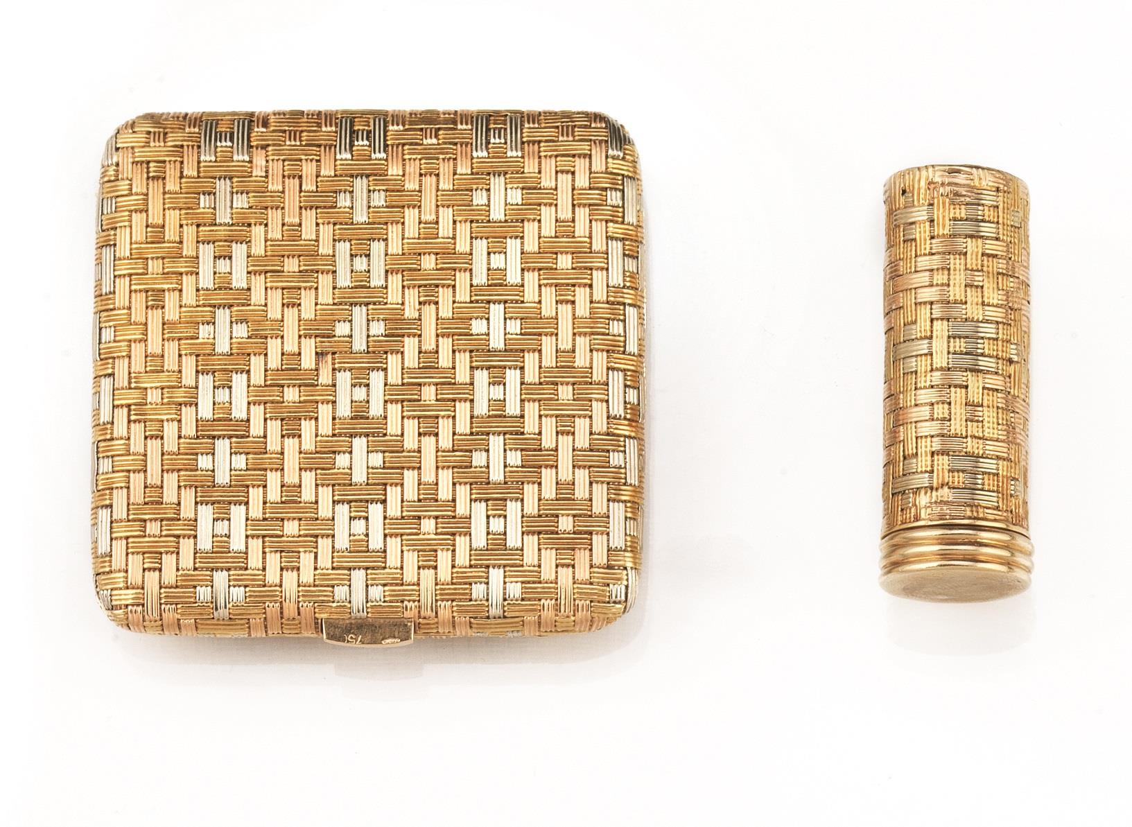 il portacipria di forma quadrata sagomata decorata con motivo a intreccio, specchio interno, punzone 750, 116 g; il portarossetto con base rotonda en suite, punzone 750, 25 g