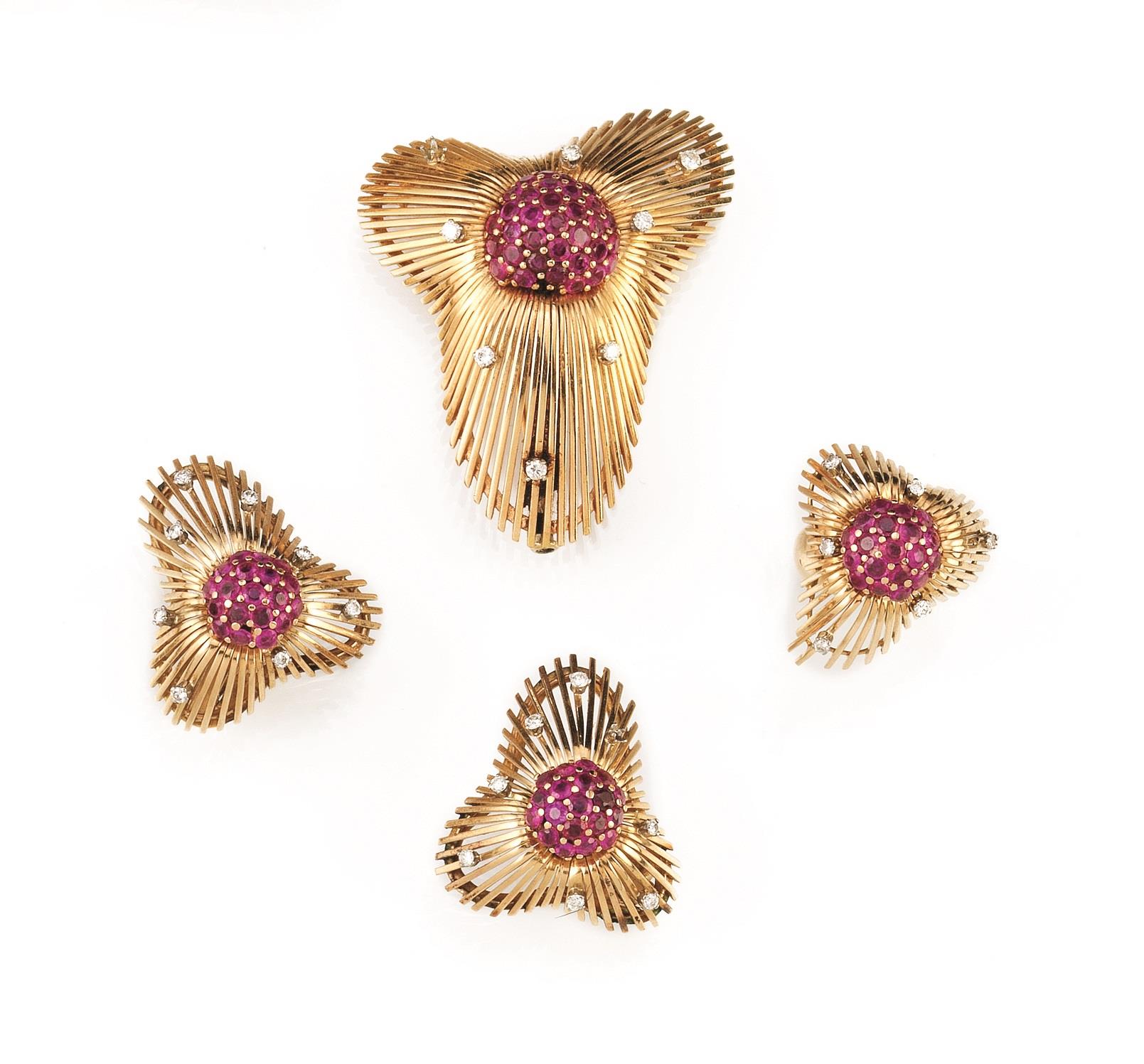 ciascun orecchino modellato a corolla stilizzata con montatura traforata in oro giallo e brillanti, al centro un motivo in rubini, 27 g; l'anello, en suite con glio orecchini, 15 g è necessaria una piccola saldatura; la spilla en suite con l'anello, 28 g un brillantino mancante