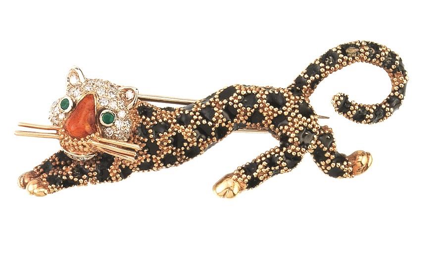 modellata come un leopardo, interamente decorato da smalti policromi, testa in brillanti, punzoni FC e 18 K, smalti danneggiati