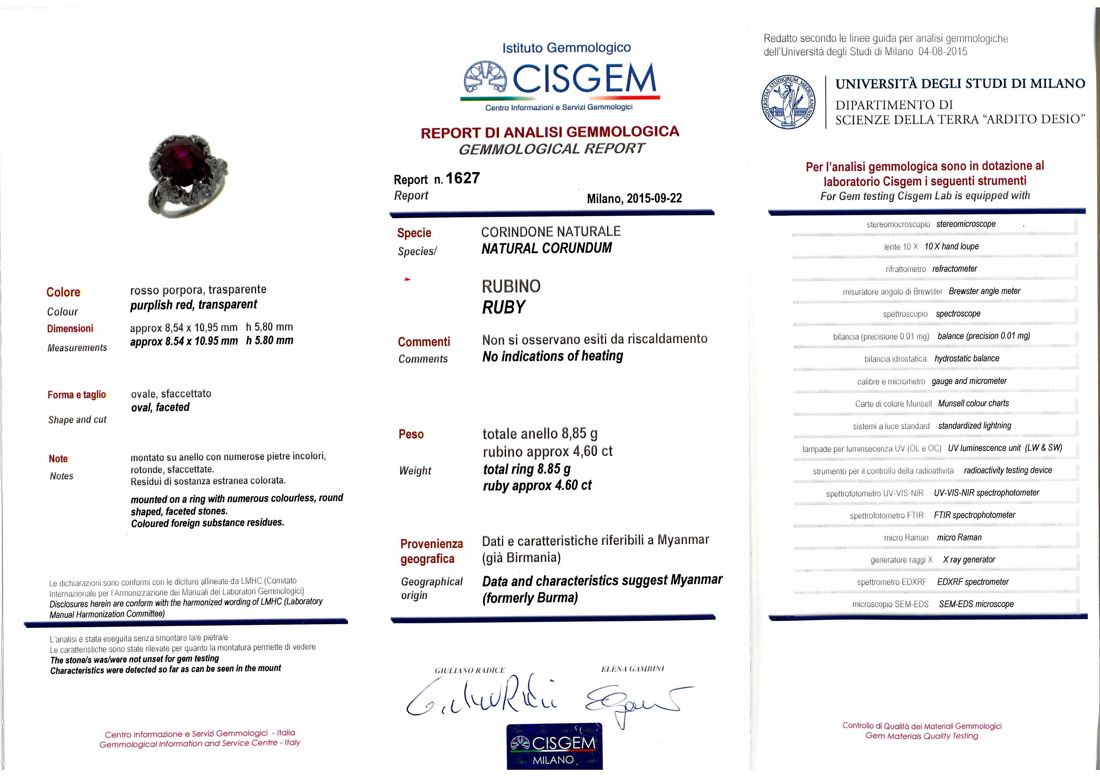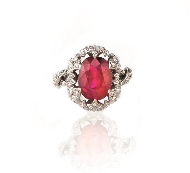 con montatura a foglie decorate in brillanti, al centro un rubino ovale di 4.60 ct, 9 g corredato di certificato CISGEM n. 1627, datato 22/09/2015 in cui si indica come provenienza Myanmar e assenza di trattamento termico