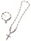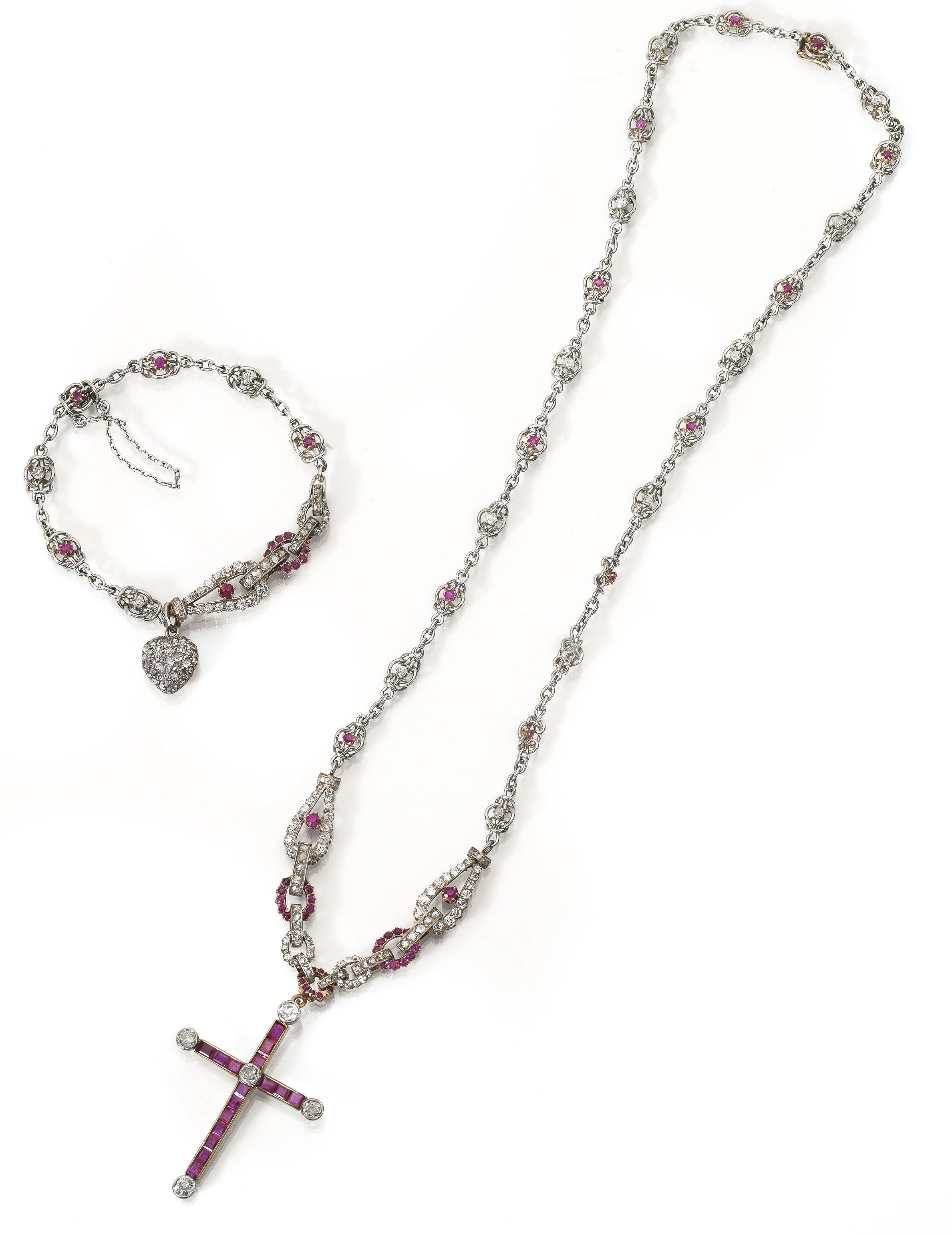 la catenina decorata da anelli in brillanti, rose e rubini, il pendente amovibile a croce decorata in rubini carre e brillanti taglio vecchio; il bracciale en suite con la collana con pendente a cuore, 50 g complessivi