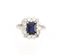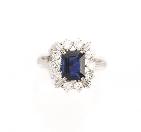 a margherita con uno zaffiro rettangolare entro cornice di brillanti rotondi e baguette, punzone 750, 4 g