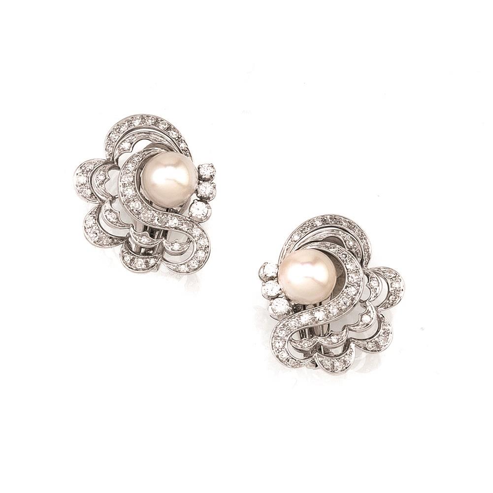 PAIO DI ORECCHINI IN ORO BIANCO, PERLE E DIAMANTIciascuno realizzato come una...