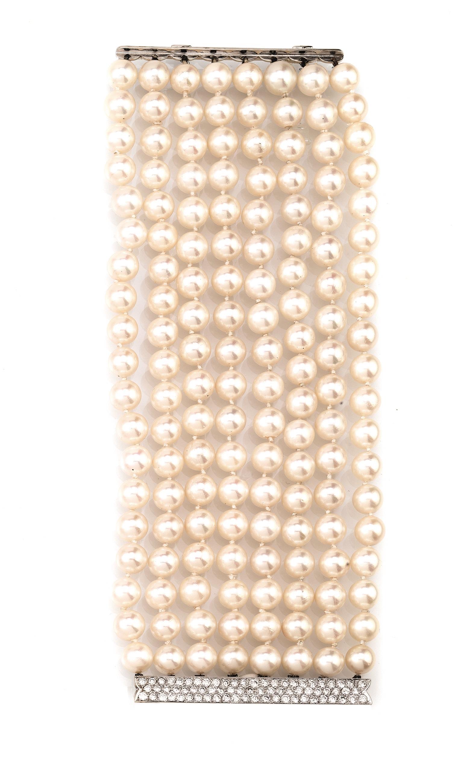 formato da otto fili di perle giapponesi coltivate diametro 8-8.5 mm, uniti da una fermatura a barretta in brillanti, 137 g