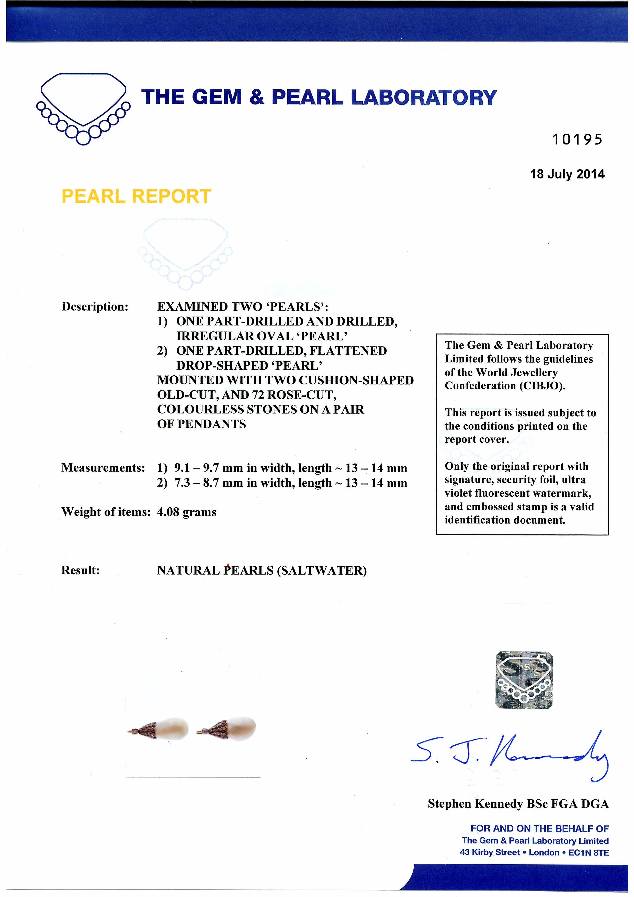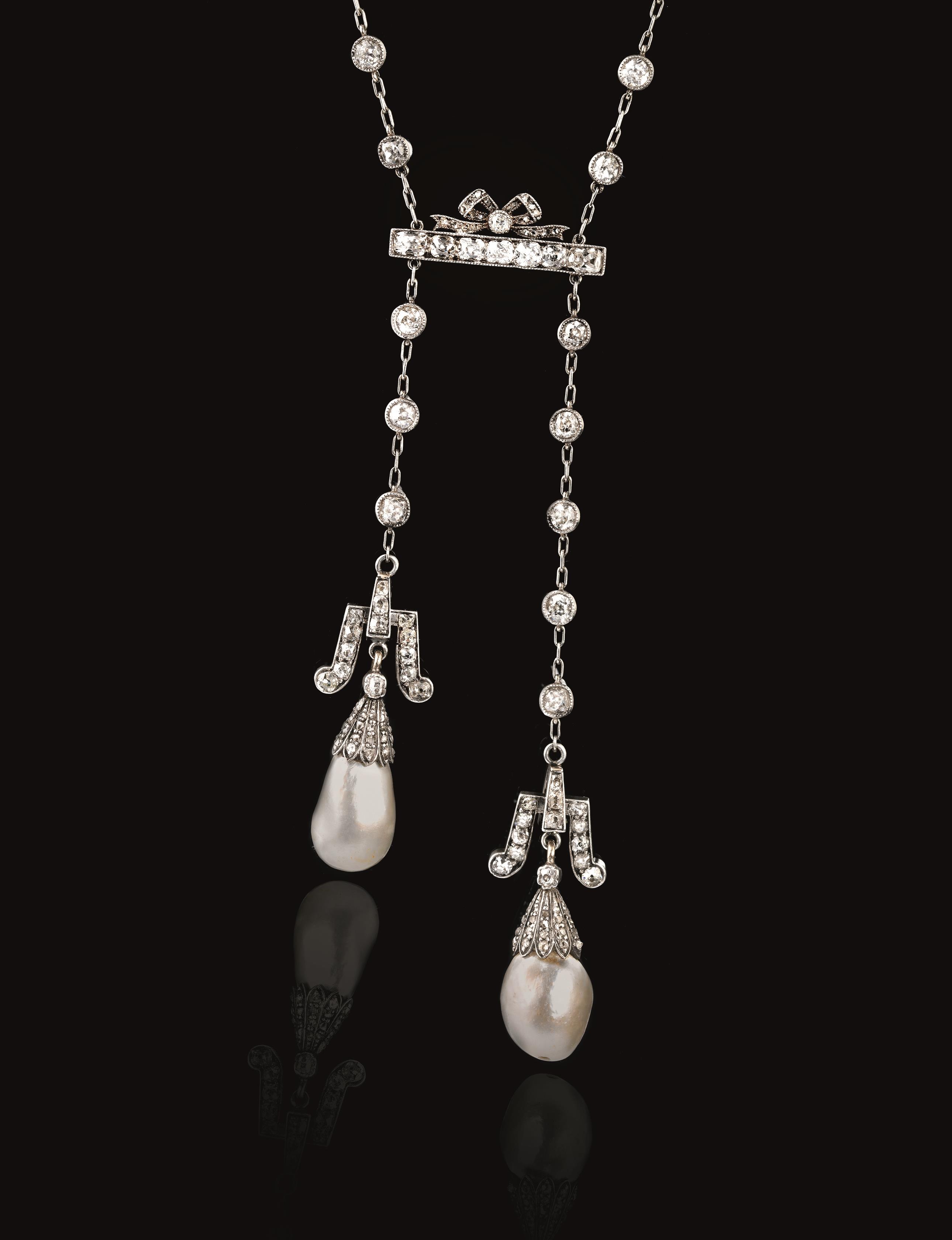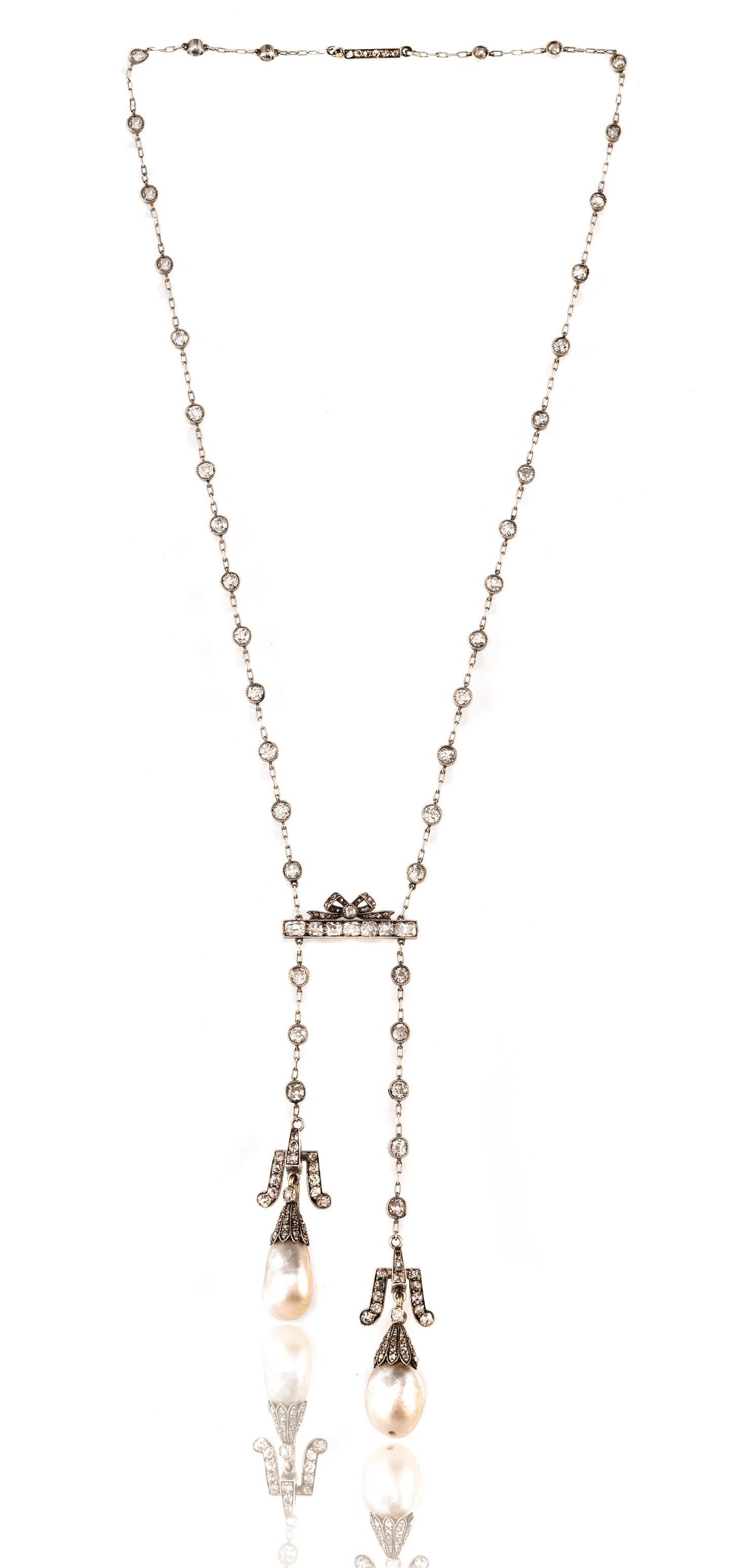 con catenina intercalata di brillanti taglio vecchio entro castoni circolari, con finali due perle naturali amovibili, corredata di certificato The Gem & Pearl Laboratory n. 10195 datato 18-07-2014