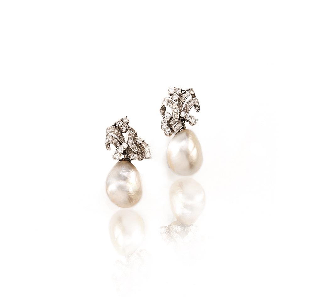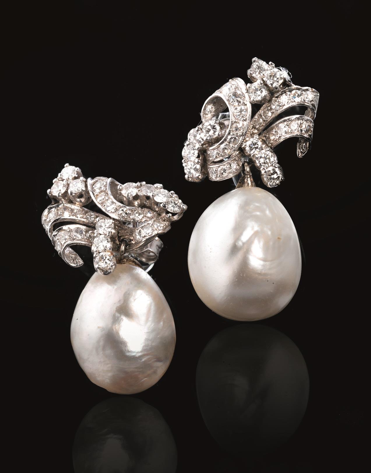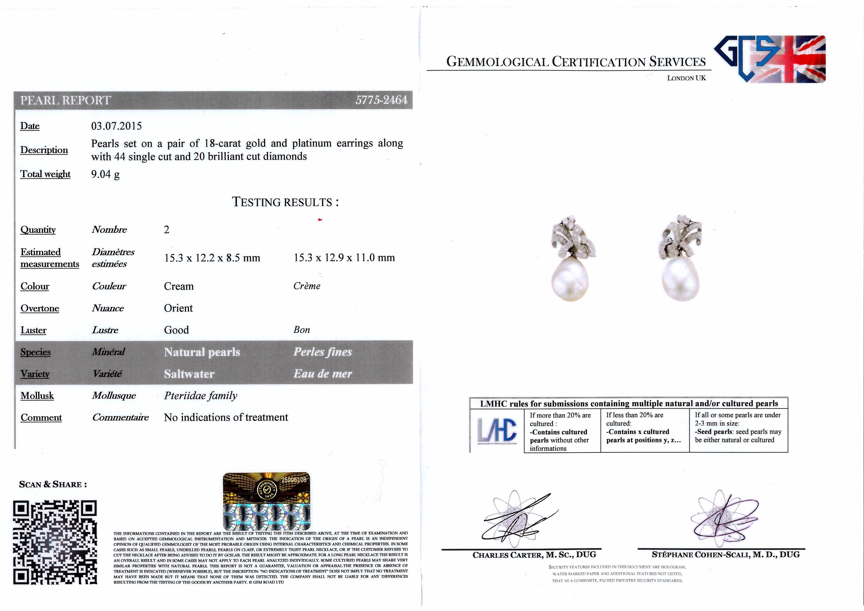 ciascuno con motivo floreale stilizzato in oro bianco e brillanti a cui è sospesa una perla naturale a goccia, corredati di certificato GCS n. 5775-2464 datato 03-07-2015