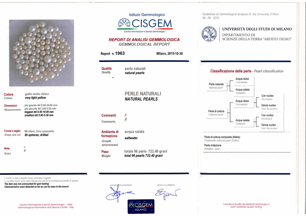 NOVANTASEI PERLE NATURALI con diametro variabile da 5.00 mm a 10 mm, corredate di certificato gemmologico CISGEM n. 1963, datato 30/10/2015