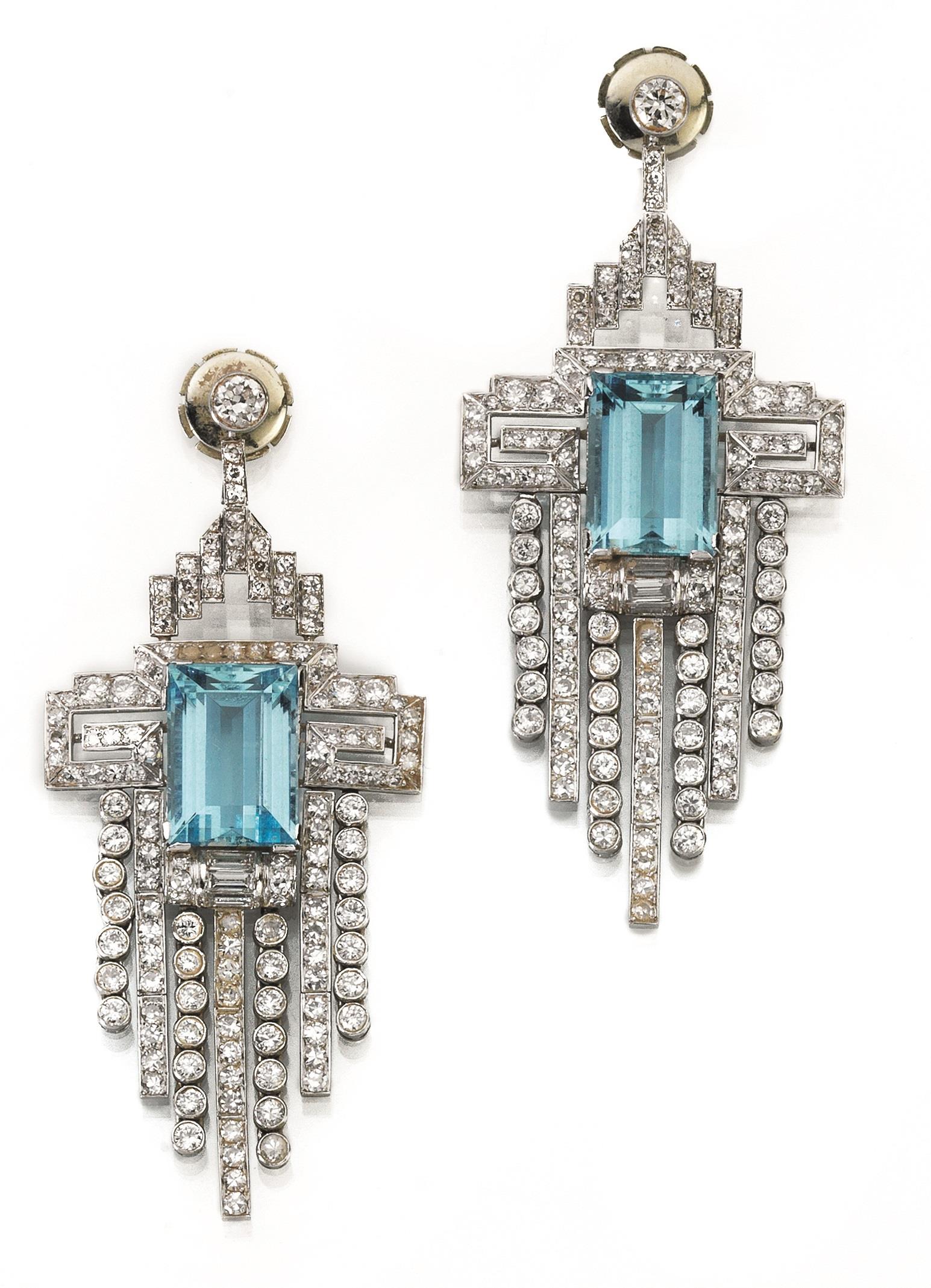 ciascuno realizzato con motivi geometrici in brillanti e frangia analogamente decorata, al centro un'acquamarina rettangolare, en suite con la collana,  punzone 750, 23 g