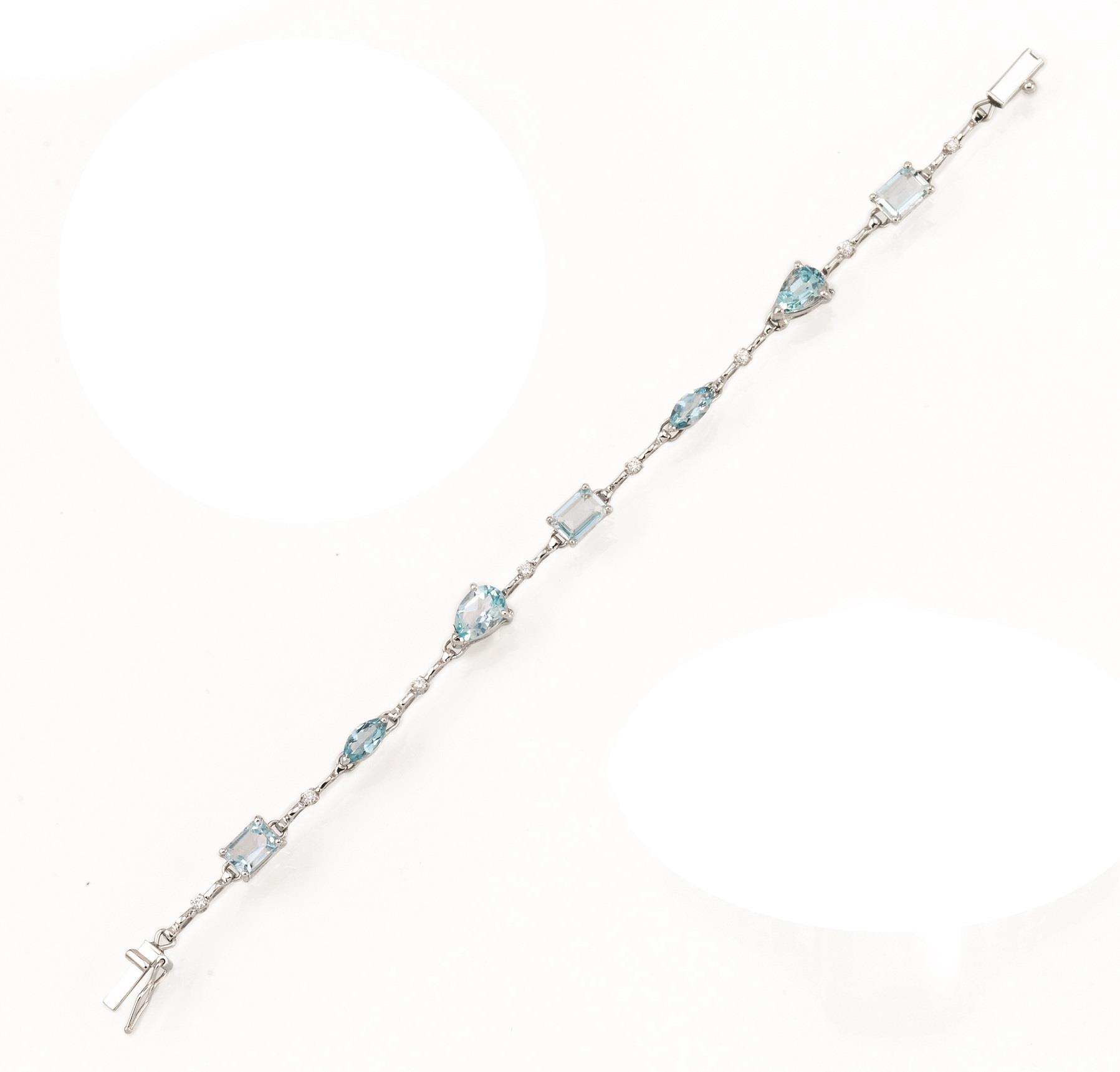 realizzato ad una fila di acquamarine a goccia, marquise e rettangolari intercalate da barrette in oro bianco e brillanti, punzone 750, 8 g