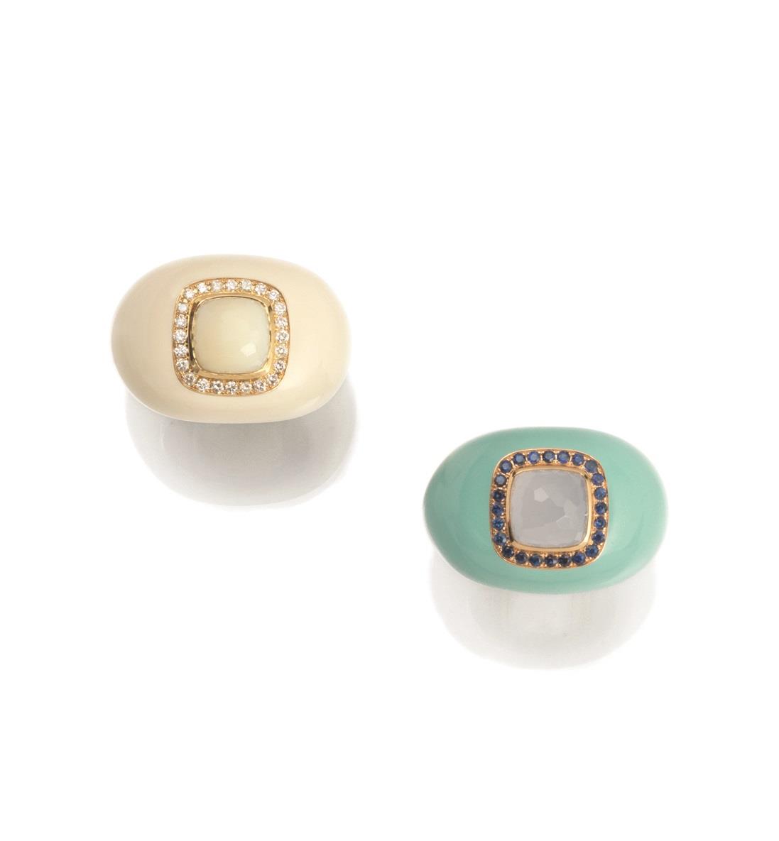 ciascuno di forma bombata interamente smaltata colore avorio o turchese, con calcedonio sfaccettato al centro di una cornice in brillanti o zaffiri, 41 g