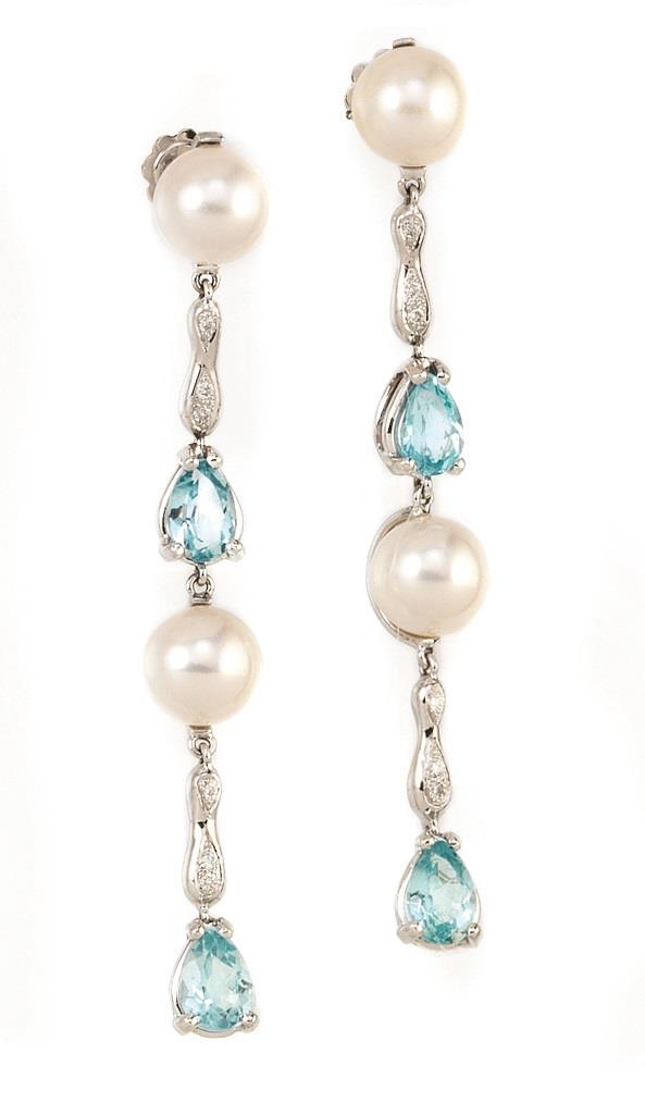 PAIO DI ORECCHINI PENDENTI IN ORO BIANCO, ACQUAMARINE E DIAMANTI